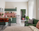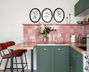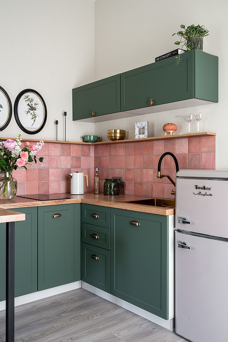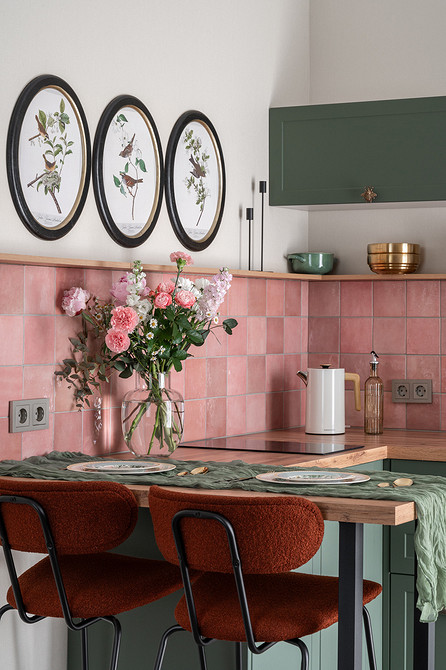Неочевидное, но очень эффектное сочетание цветов. В проекте Анастасии Дубовсковой — студия для сдачи в аренду в Сочи — эти оттенки прослеживаются в разных элементах интерьера, при этом не перегружая его, так как цвет стен в студии — светлый бежевый. Приглушенный зеленый цвет кухонного гарнитура сочетается с розовой плиткой на фартуке и деревянной столешницей. Дерево повторили в виде полки над кухонным фартуком.