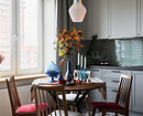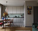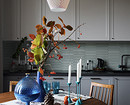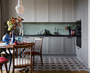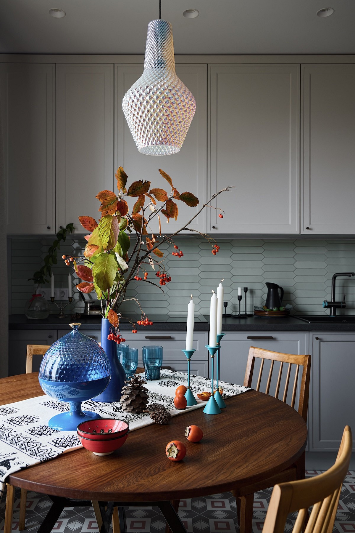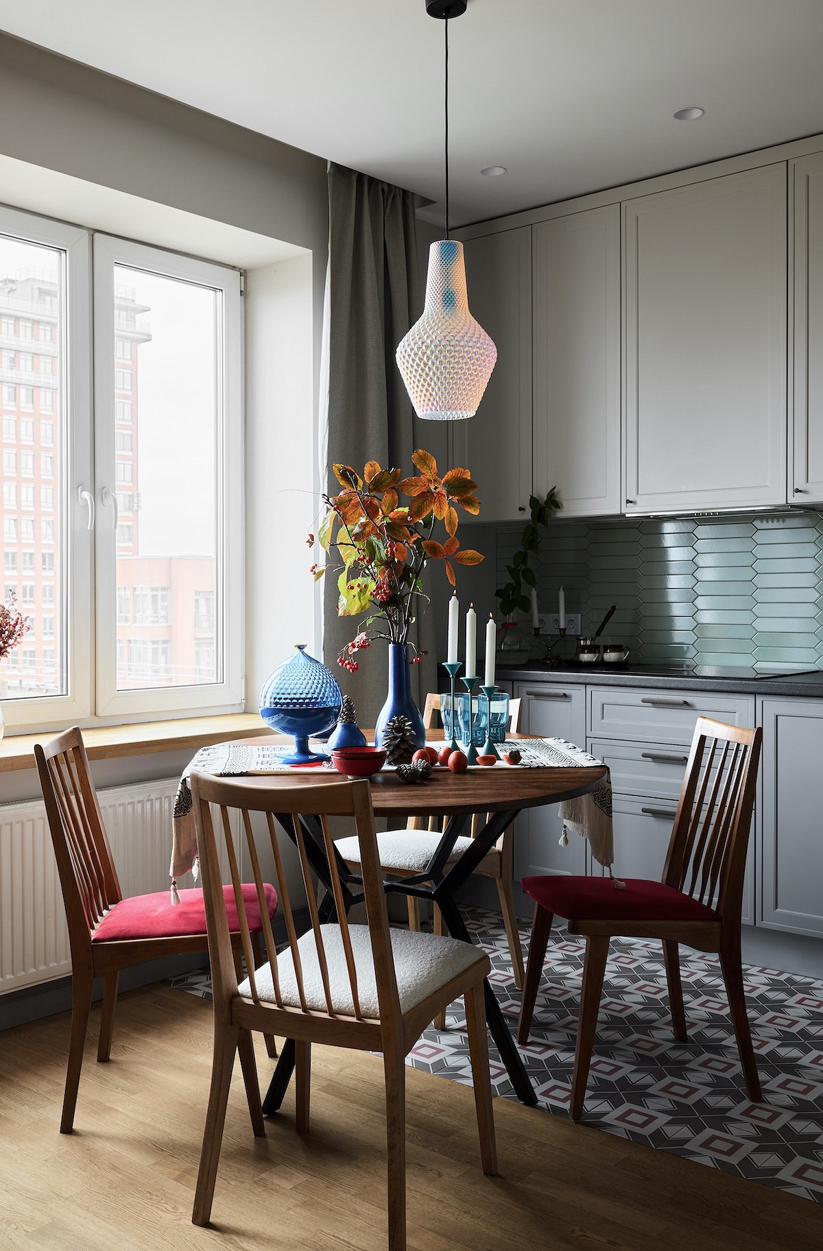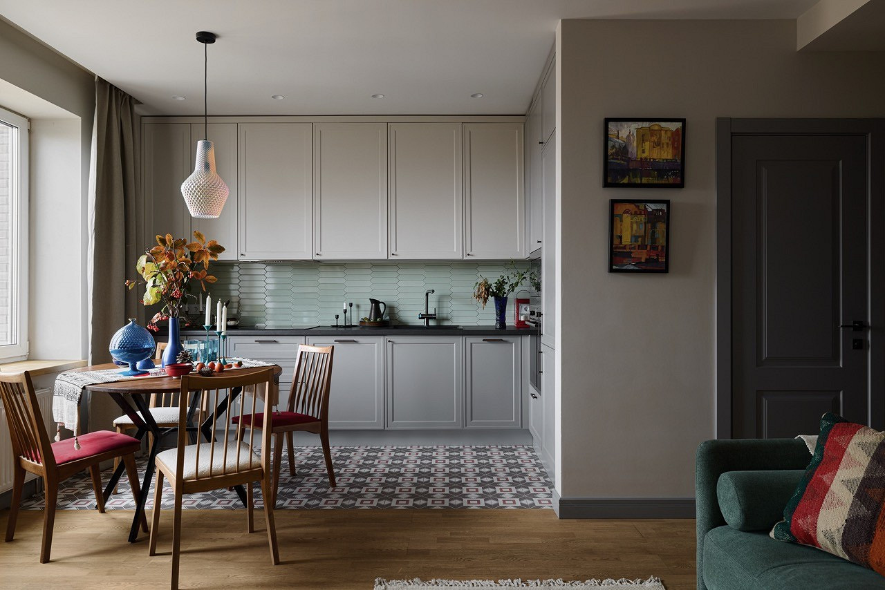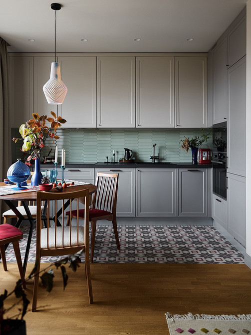 В своей квартире дизайнер Наталия Борисенкова расставила акценты с помощью цвета очень деликатно: в основном, в виде мебели, текстиля и яркой плитки. На кухне, например, основной цвет — серый, такой цвет краски дизайнер выбрала для стен. В цвет стен выполнен и кухонный гарнитур — это частый прием, чтобы «растворить» массивную мебель визуально. К серому цвету фасадов подобрана мятная плитка на фартуке. Интересен не только цвет плитки, но и форма — вытянутые ромбики, уложенные горизонтально.