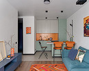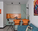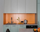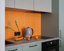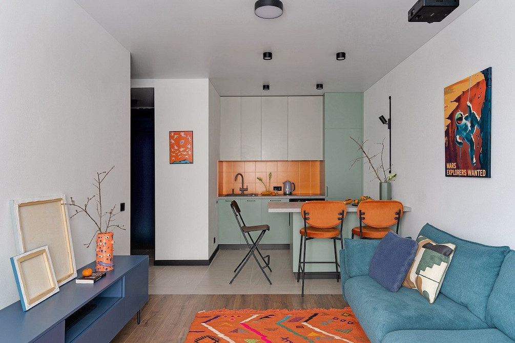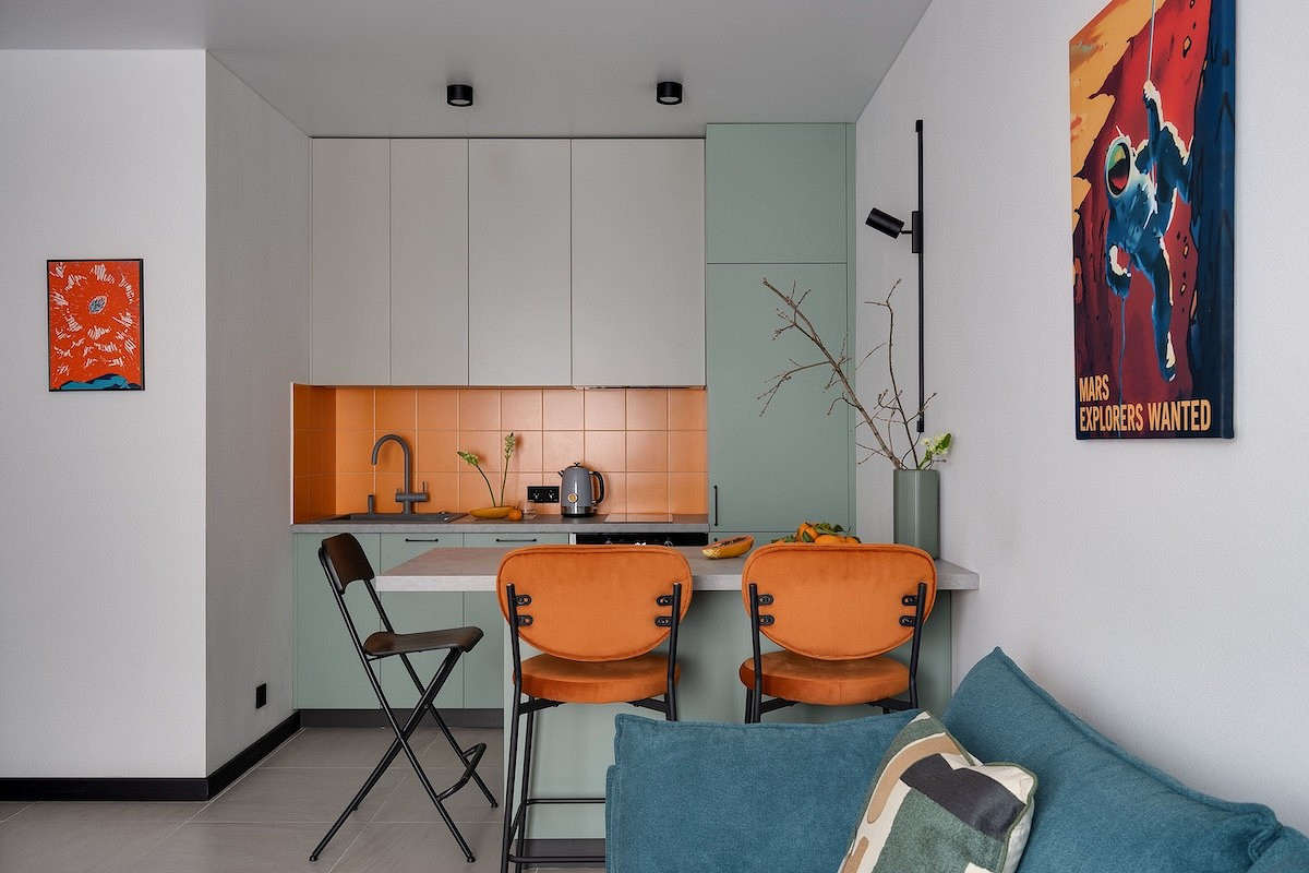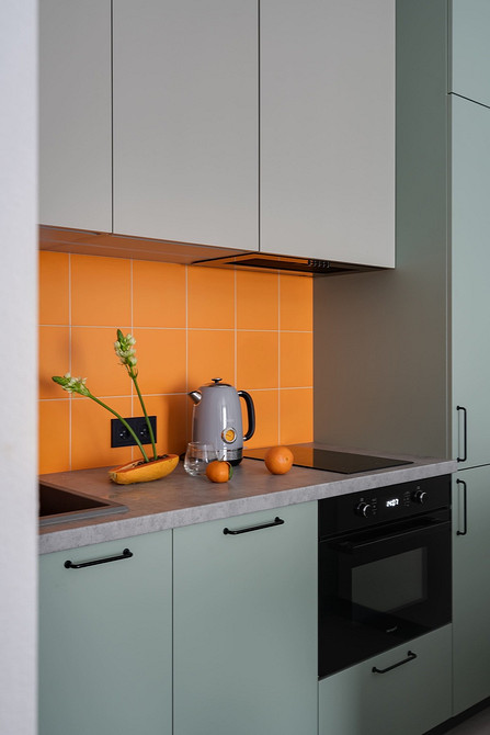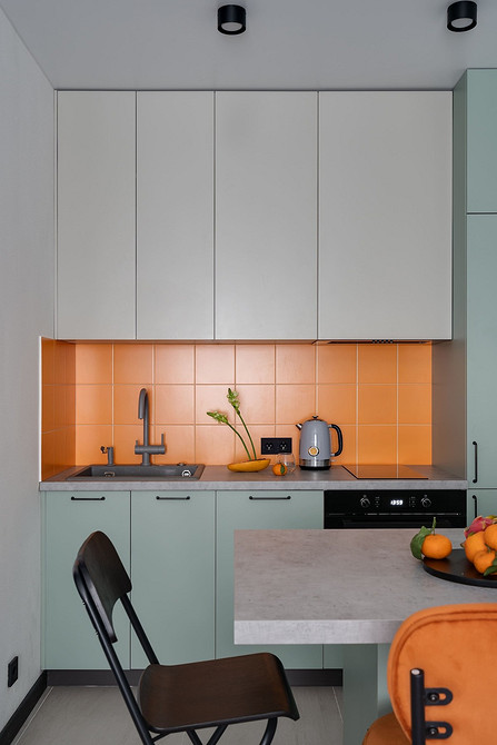 Оранжевый — довольно сложный цвет для использования в интерьере: он яркий и от него легко «устать». Поэтому в больших объемах оранжевый используют редко, но для акцентов он отлично подходит. В этом проекте дизайнер Кристина Голубева внесла оранжевые акценты, вдохновившись постером заказчика. Так оранжевый появился в виде плитки на фартуке, обивке стульев и ковре (его заказчик подобрал сам, согласовав с Кристиной). Оранжевая плитка на фартуке кухни отлично сочетается с приглушенным зеленым цветом фасадов нижних шкафов и шкафа-колонны. Верхние шкафы гарнитура выполнены в цвете стен.