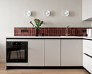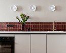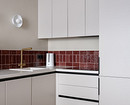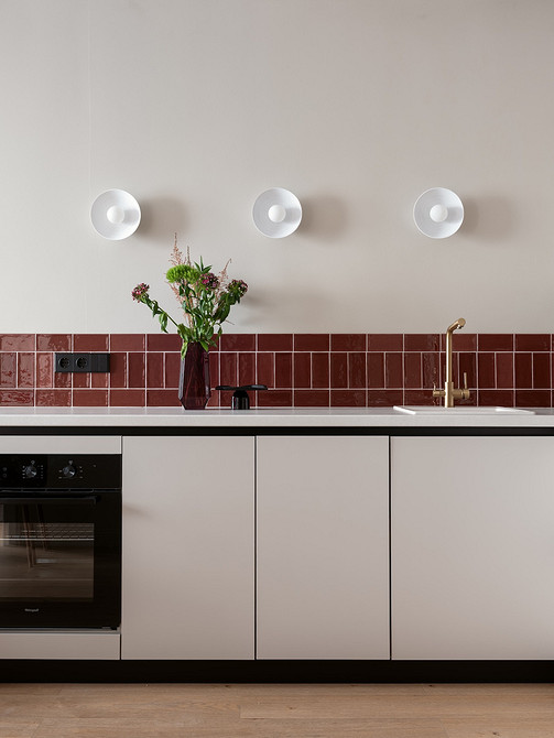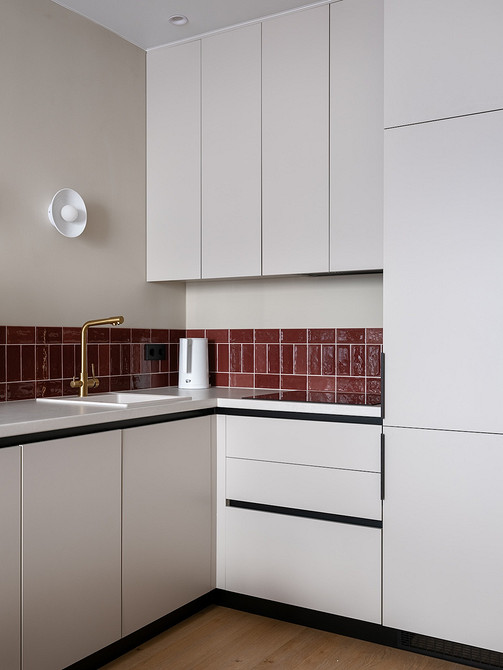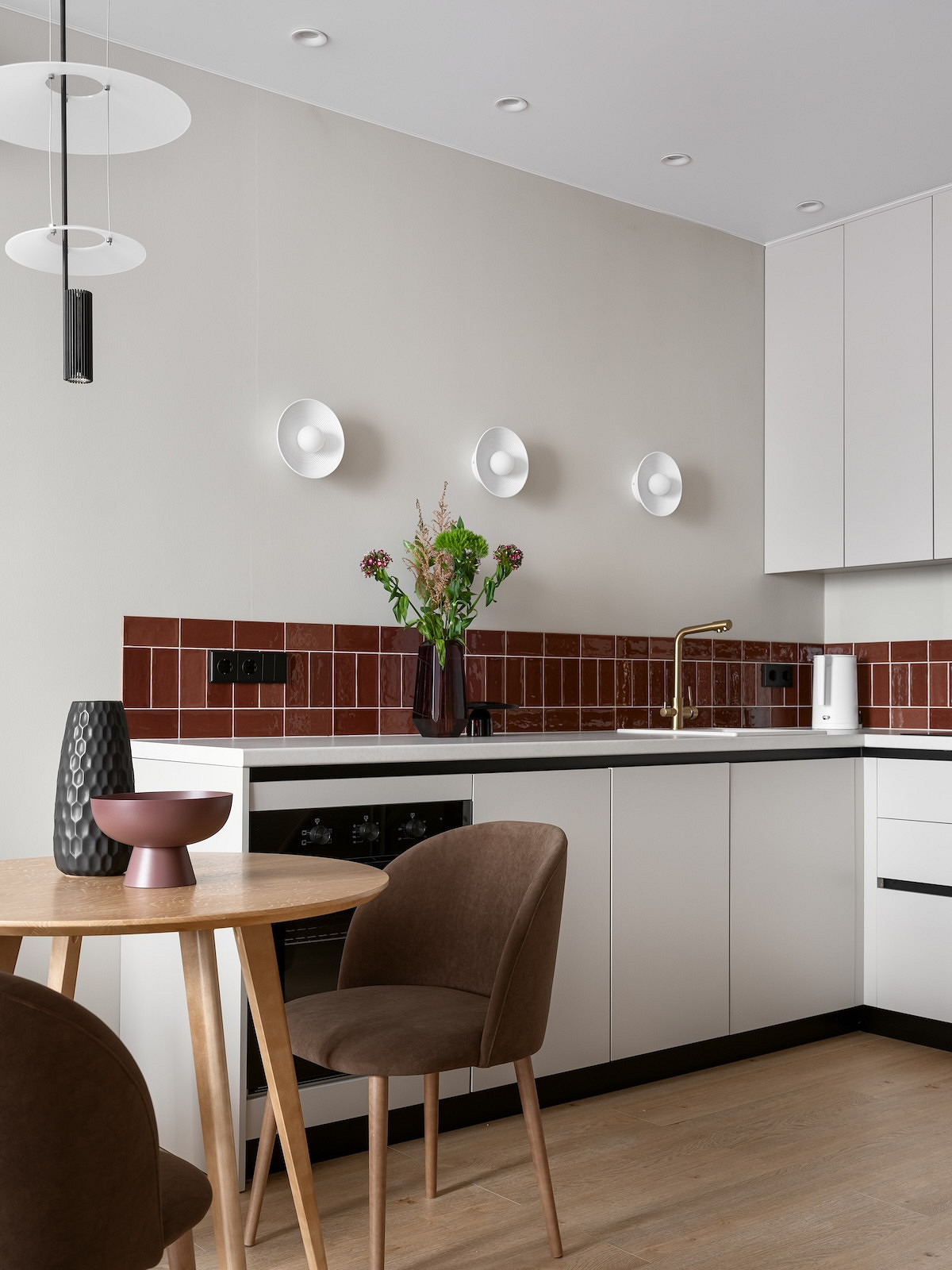 Бежевая кухня — такая же база, как белая или серая. В этом проекте дизайнеров Юнны Лукинских и Евгении Ануфриенко из Yuloo Studio цвет кухонных фасадов совпадает со стенами, что позволяет сделать кухню по максимуму незаметной. Однако для нейтральной кухни дизайнеры нередко выбирают яркий фартук, чтобы сделать пространство более эффектным. Так поступили и в этом случае: на фартуке уложена плитка красивого винного оттенка. Винный цвет также использовали на стенах прихожей, которая просматривается из кухни.