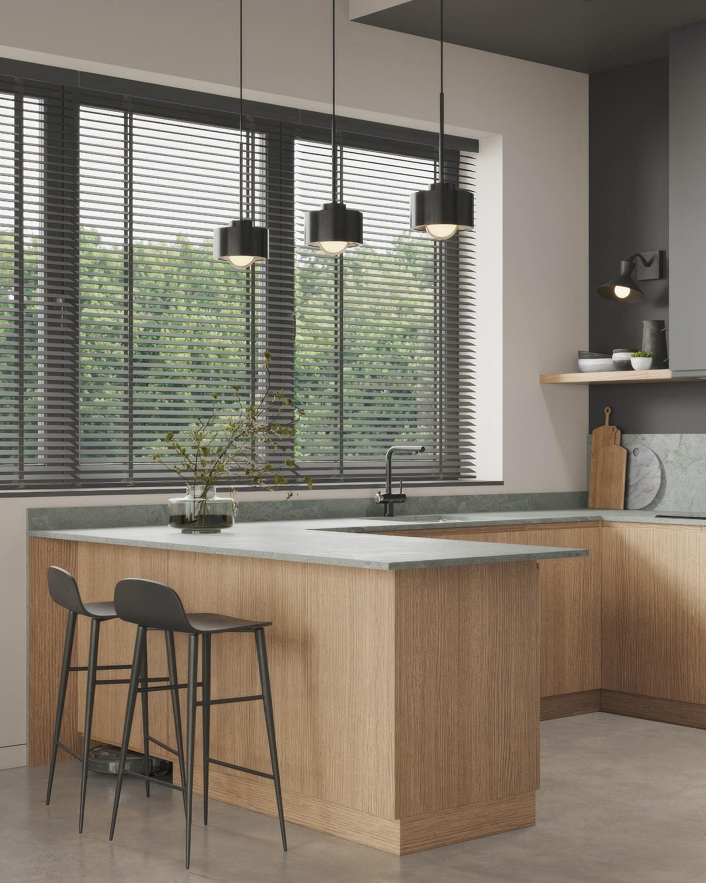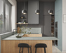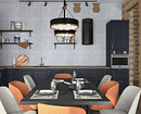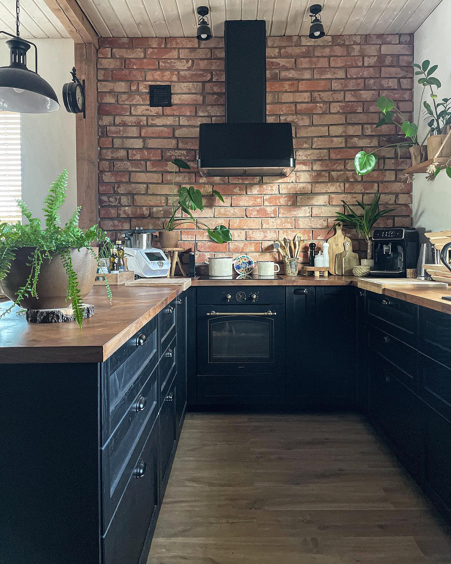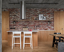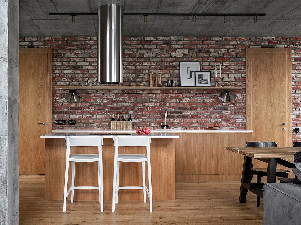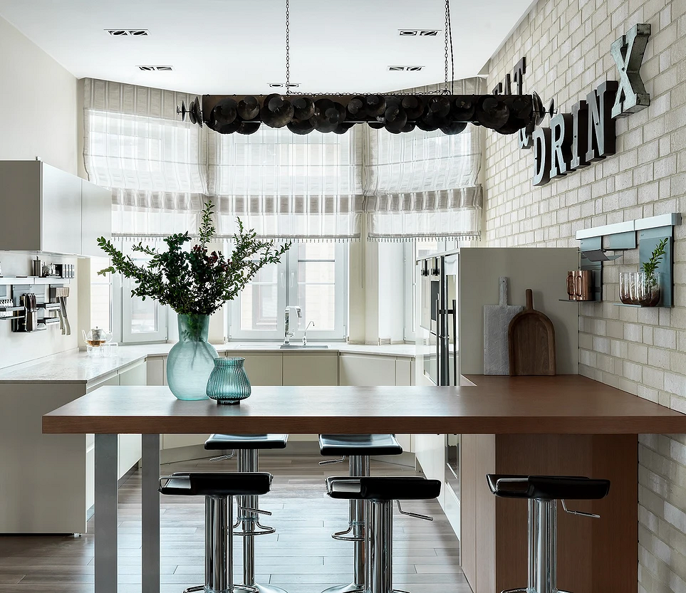 Органично будут смотреться металлические фасады и хромированные детали. Грубость бетона можно подчеркнуть с помощью монолитного куска древесины — например, сделать из него стол или барную стойку. Это направление не любит плавных линий и монотонности, поэтому бытовая техника может быть не встроенной, а отдельно стоящей, обязательно — темной.