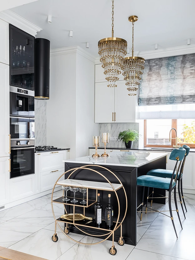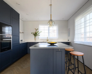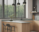 Независимо от того, каким способом размещен гарнитур, в больших домах часто встречается композиция с островом. Он может быть инструментом зонирования, незаметной частью рабочей зоны или же центральным элементом интерьера. Также конструкция используется для дополнительного хранения и как альтернатива классическому обеденному столу — в последнем случае можно использовать модель с разноуровневой столешницей. А если гарнитур линейный, в остров часто встраивают варочную панель или мойку, чтобы получить более правильный рабочий треугольник.
