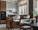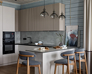 На современной кухне органично смотрятся хромированные элементы и крупные формы. Все линии — строгие, поэтому предпочтение отдается гладким фасадам и встроенной технике.
