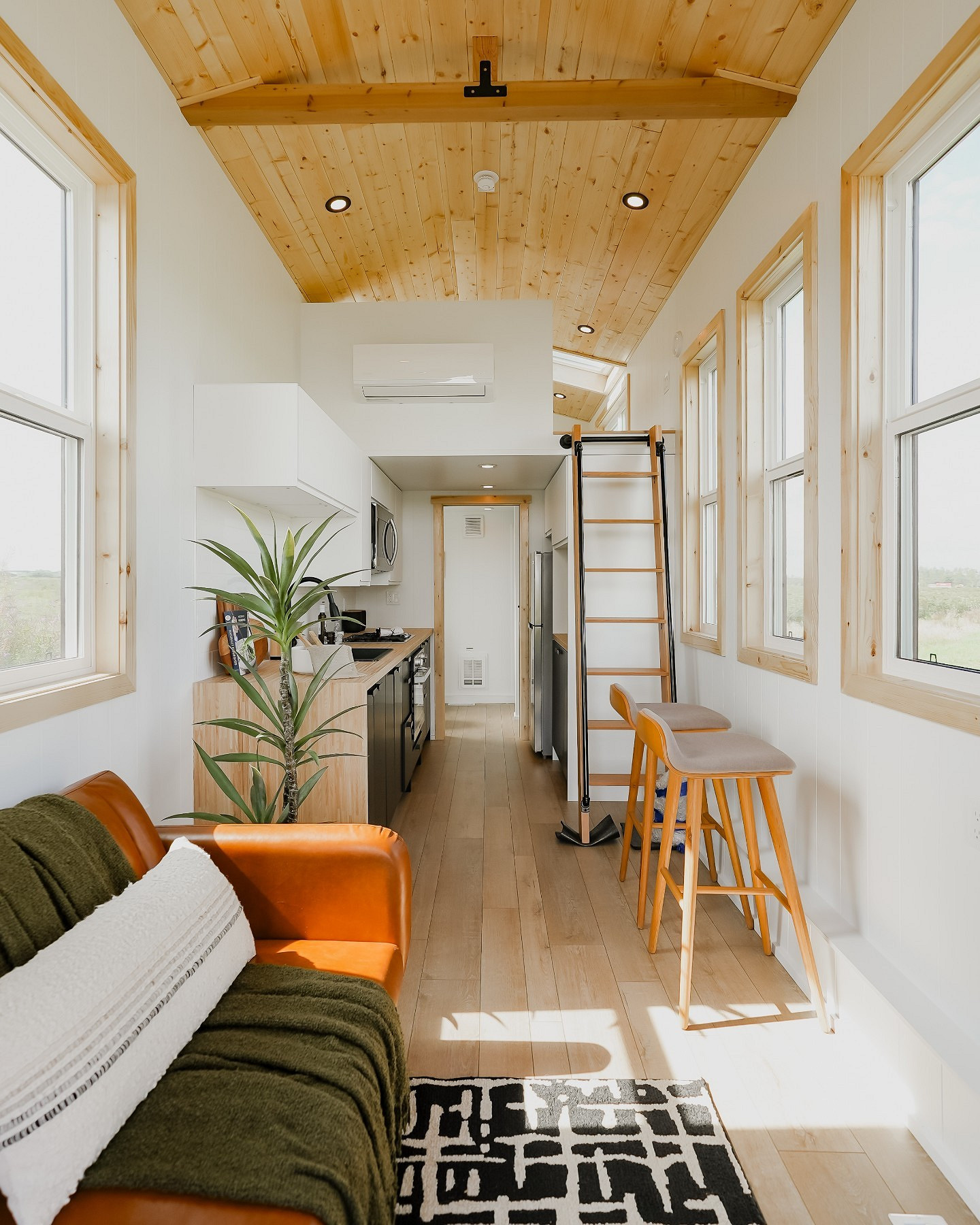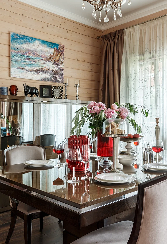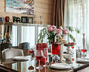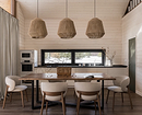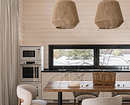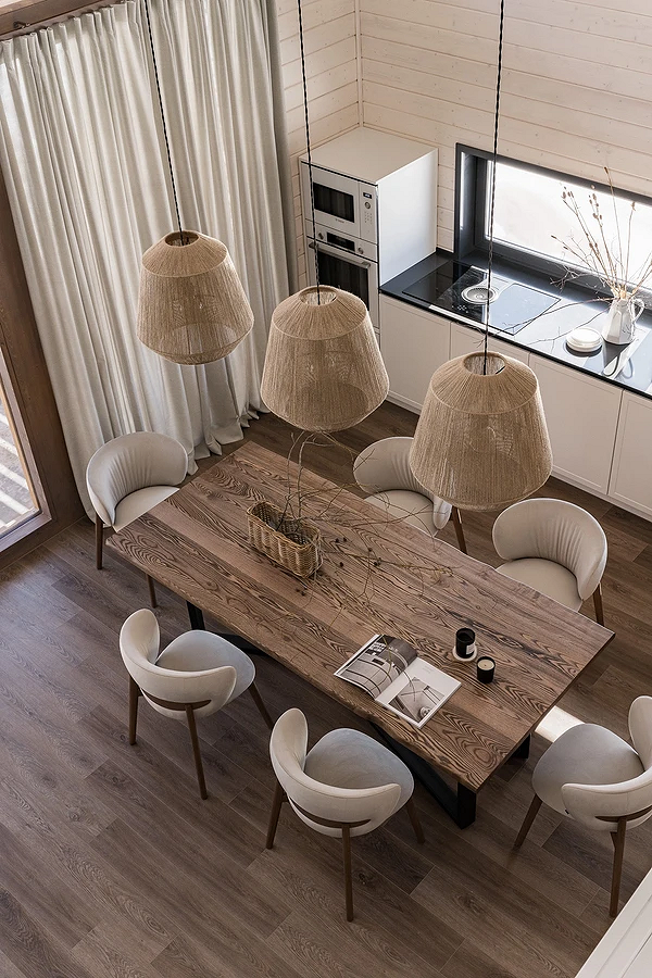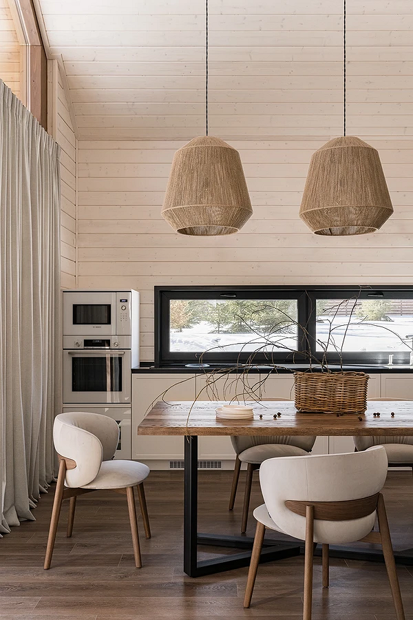 Главный элемент декора — природа за окном, поэтому если есть возможность, то зоны готовки и отдыха размещаются в части здания с панорамными (или просто большими) окнами без штор. Естественную красоту пейзажа дополняют натуральным текстилем и продуманным декором, часто тоже из природных материалов. Не должно быть много бесполезных мелочей: лучше пара предметов, но уникальных и несущих смысл.