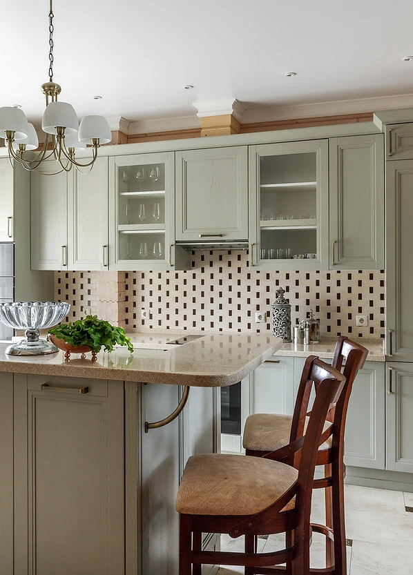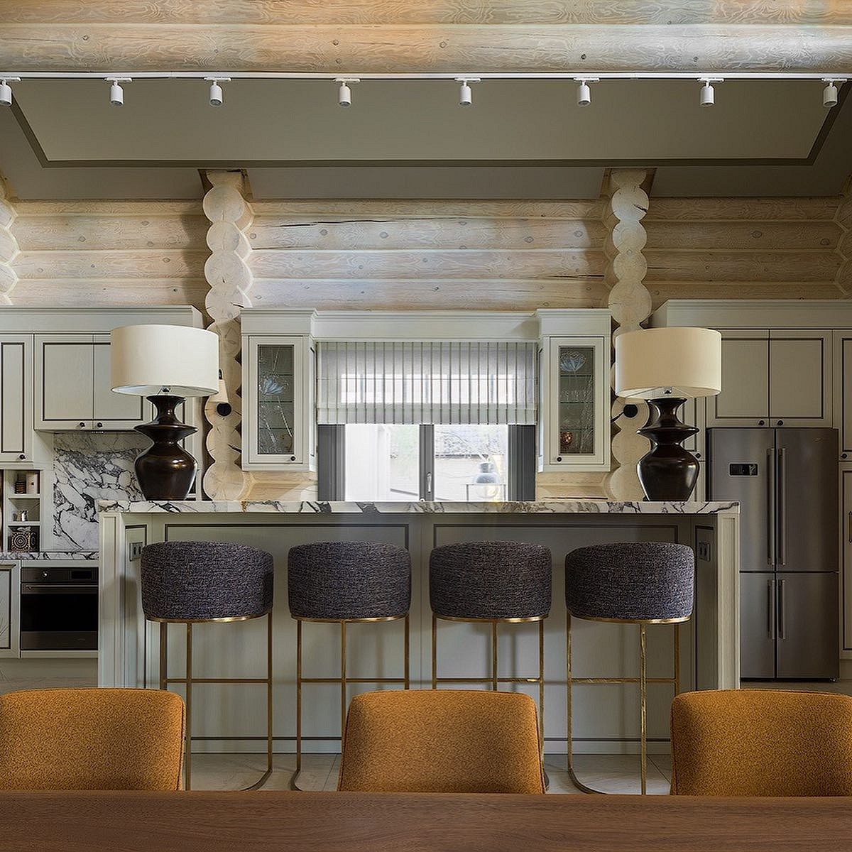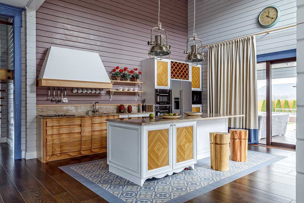 Для семейного гнезда, которое строится на века, в качестве основного строительного материала можно использовать камень. Для оформления интерьера будет уместен традиционный стиль: классика, в том числе английская и американская, или более легкая неоклассика. Такие поместья обычно располагают большой площадью и внушительным бюджетом, поэтому при оформлении зоны готовки главное — подчеркнуть качество ремонта и монументальность постройки.