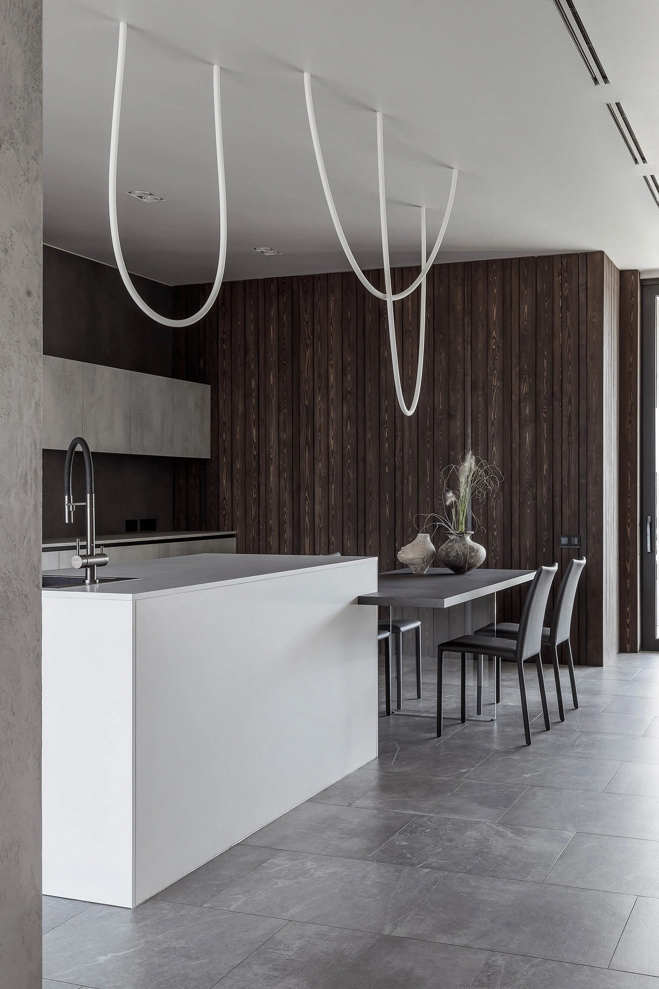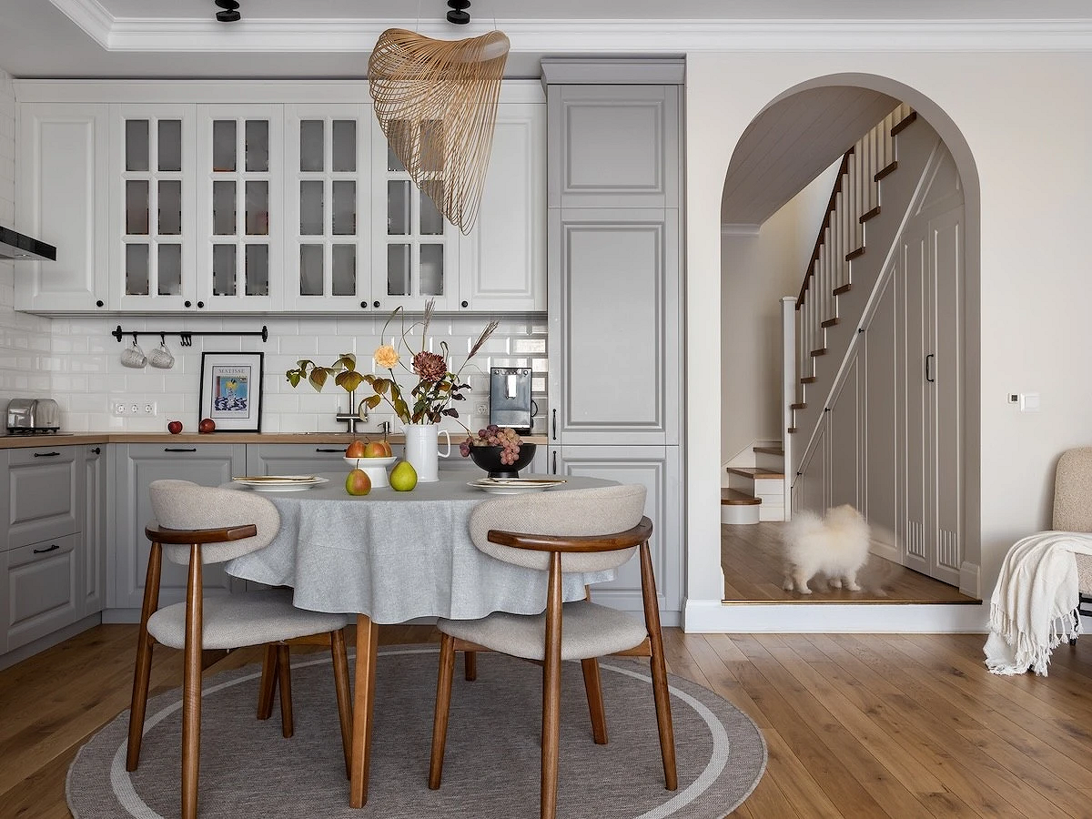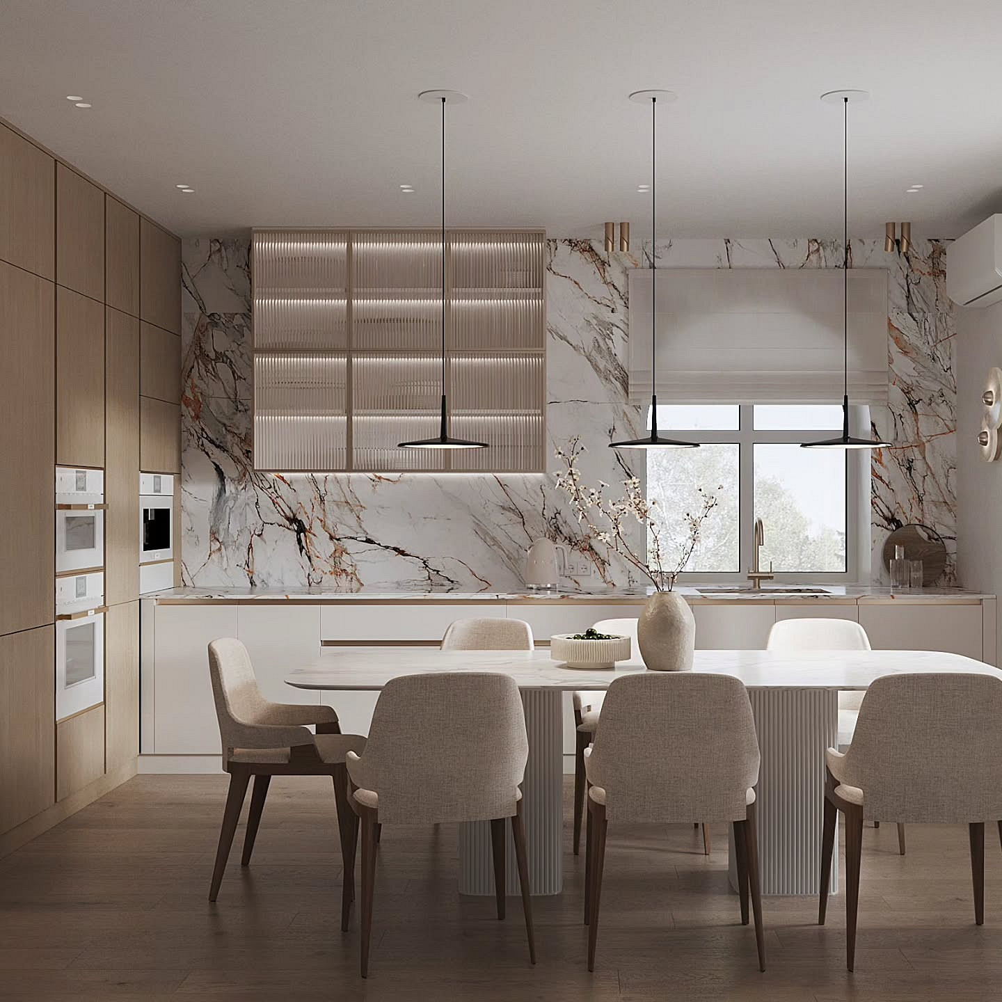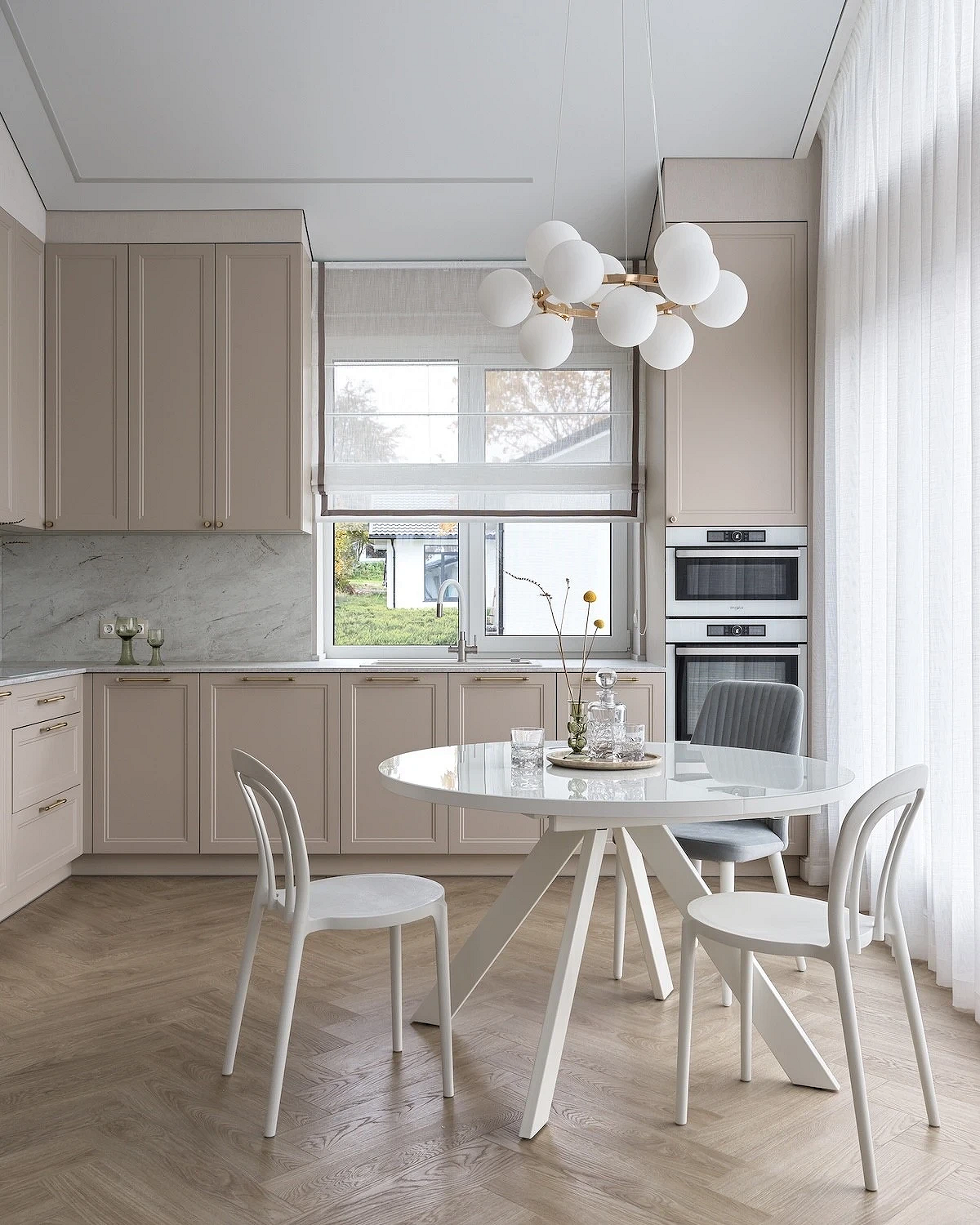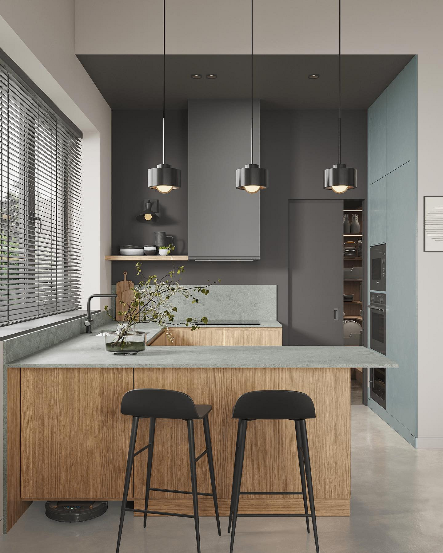 Если в архитектуре вам нравится лаконичность, строгие линии и философия «меньше значит больше», то вам подойдут такие современные стили, как минимализм и контемпорари. Оба эти направления предполагают минимум мебели и аксессуаров, смещая акцент на пространство, формы и фактуры. Минималистичный интерьер практически монохромный — используются оттенки белого, черного и серого, иногда с вкраплениями бежевого или коричневого. Контемпорари предполагает больше свободы: можно поэкспериментировать с яркими оттенками и сложной палитрой, но важно избегать кислотных, слишком простых цветов, которые дешевят кухню. Лучше всего вдохновляться окружающей природой и брать на заметку естественные тона.