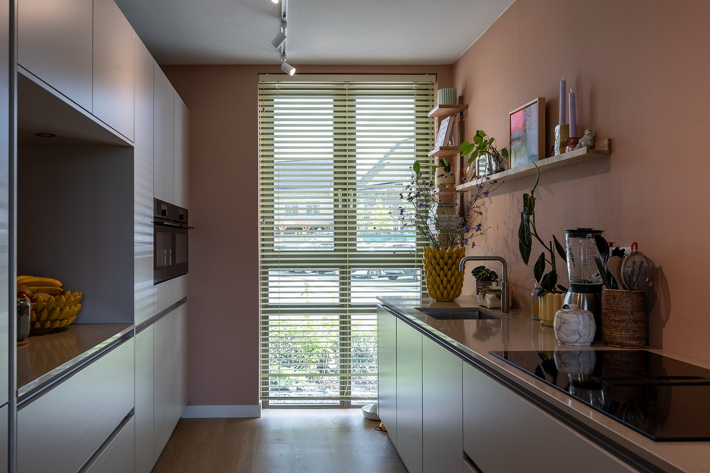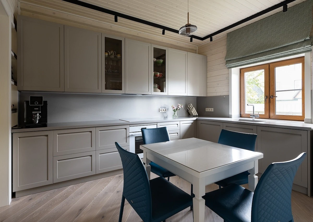 Упрощенный вариант предыдущей схемы, где гарнитур располагается не по трем стенам, а по двум, образуя прямой угол. Такой способ расстановки мебели подходит для помещения с большим окном — одну из сторон можно сделать с верхними шкафчиками, а вторую — без них. Часть, идущую по стене без окна, можно использовать для максимально функционального хранения, выбрав сплошные верхние шкафчики до потолка. Также часто угловую планировку используют в дизайне маленькой кухни в частном доме.