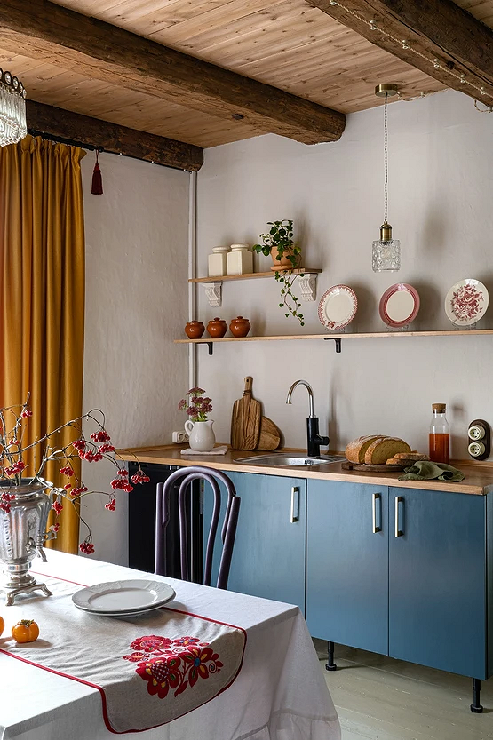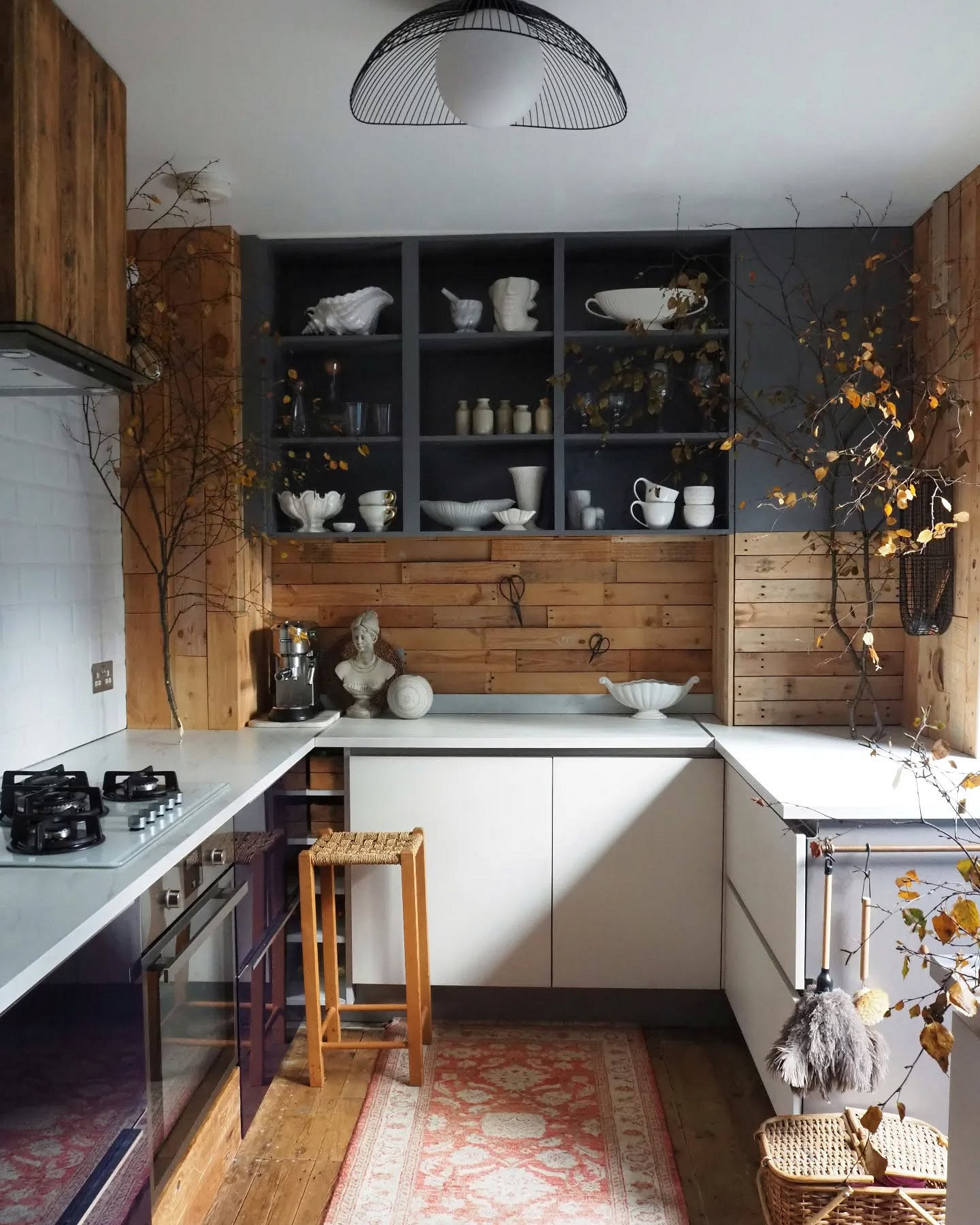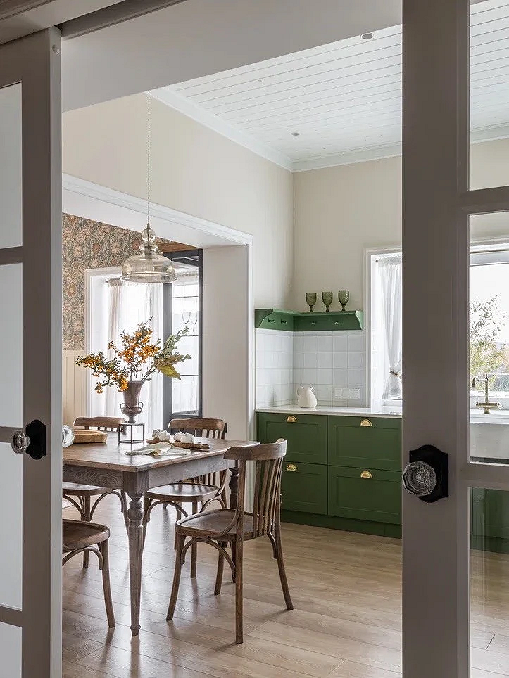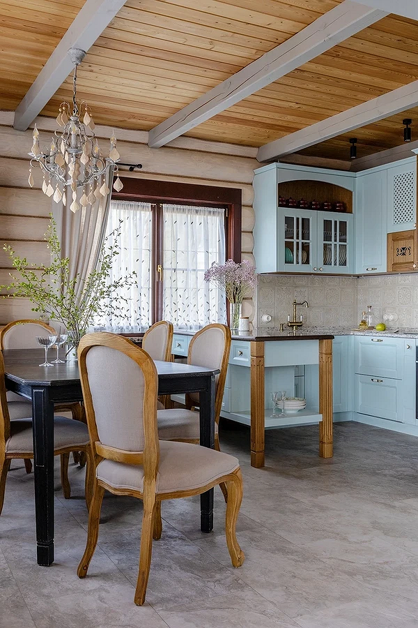 Их объединяет фокус на экологичность, от использования натуральных материалов до цветовой гаммы; отделка деревом и камнем; естественные оттенки зеленого, серого, бежевого и коричневого. Декор не из масс-маркета, а предметы народного промысла: деревянная и глиняная посуда, картины, вышивка, фигурки, керамика, предметы из ротанга. Органично будет смотреться настоящая либо декоративная печь.