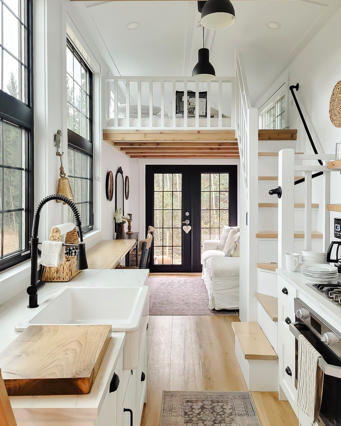 Эта стилистика похожа на предыдущую, но смотрится более уместно в современных коттеджах, таунхаусах и модульных домах.