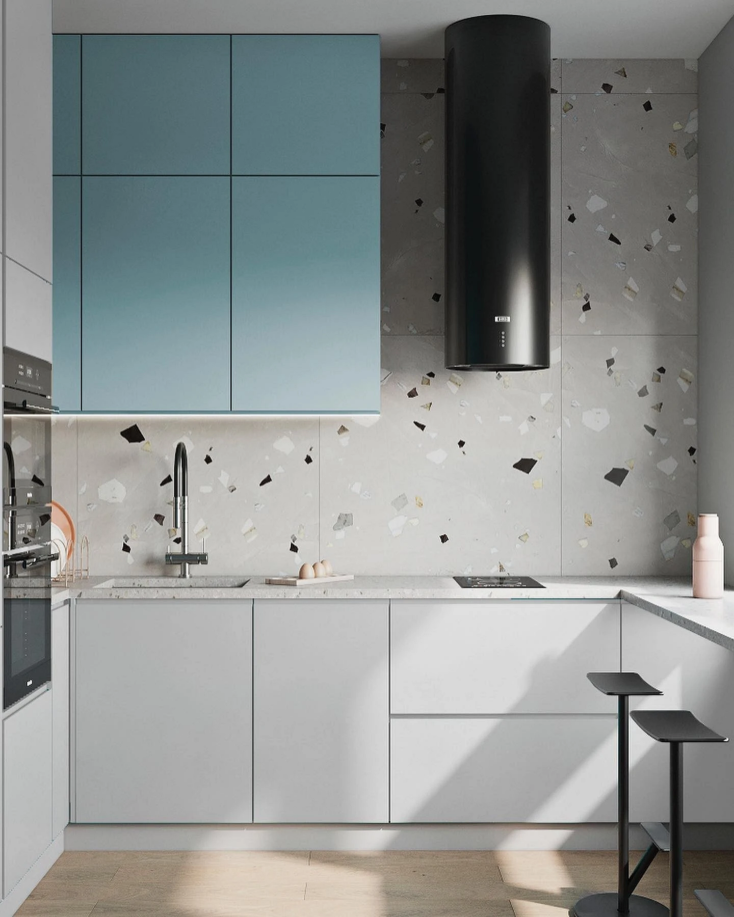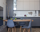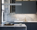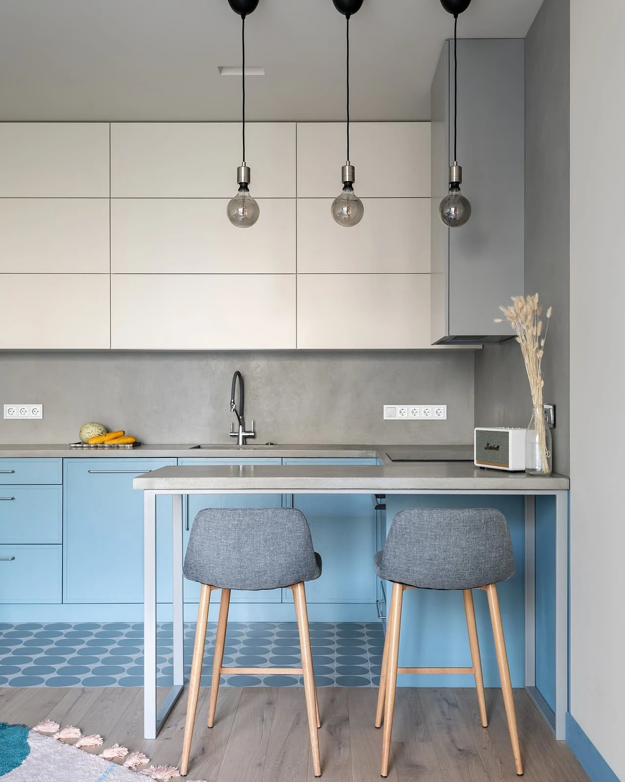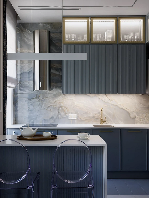 Серо-голубая кухня в зависимости от выбранной гаммы может быть как теплой и уютной, так и наполненной прохладной свежестью. Чем более холодная палитра выбрана, тем аристократичнее и строже выглядит комната. Для мягкого, неброского дизайна в скандинавском или экостиле подбирают приглушенные тона: пепельный, агатовый, васильковый, гиацинтовый. Для таких направлений, как хай-тек и модерн, подойдут более контрастные краски, например, насыщенный темно-асфальтовый и лазурно-голубой.