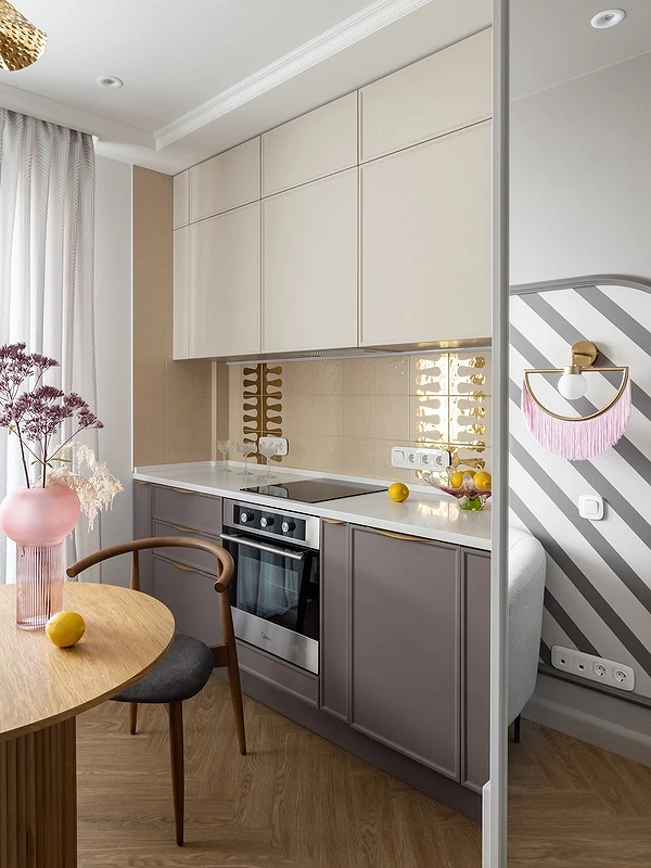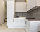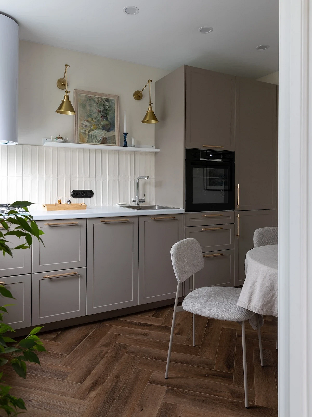 Светло-коричневые тона органично сочетаются с ахроматами. И серо-бежевая кухня выглядит стильно и гармонично. Но при неудачном выборе оттенков они могут сливаться, поэтому их следует разделять яркими вставками или подбирать расцветки так, чтобы они контрастировали друг с другом.