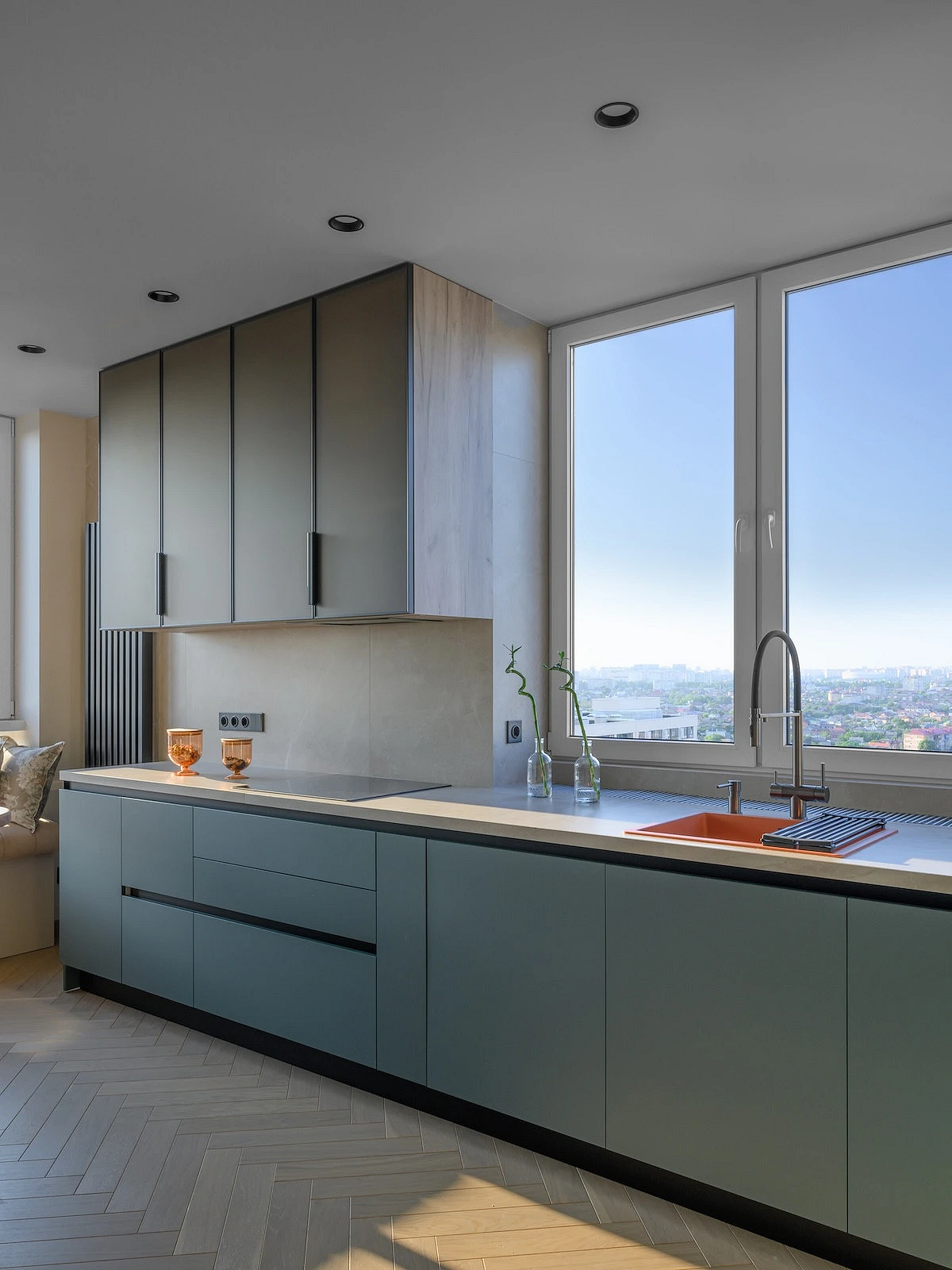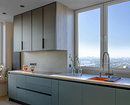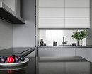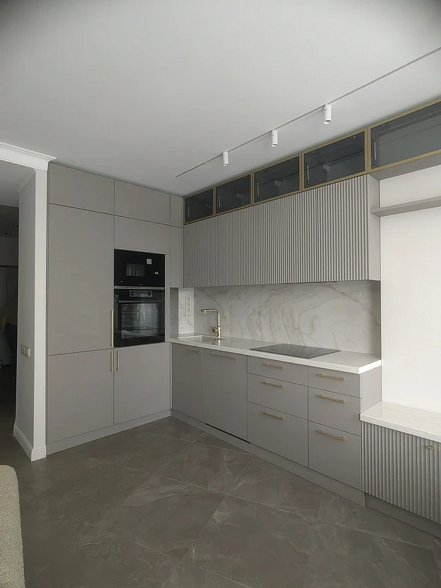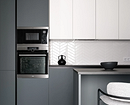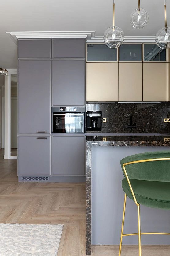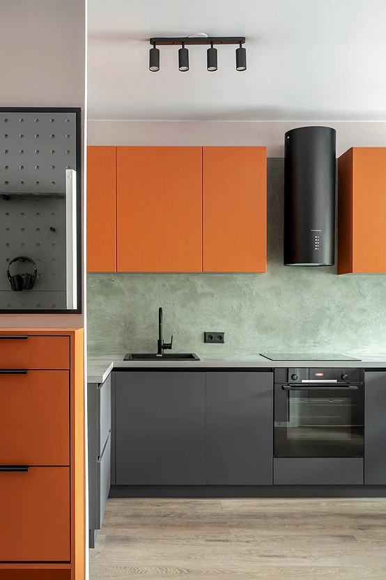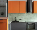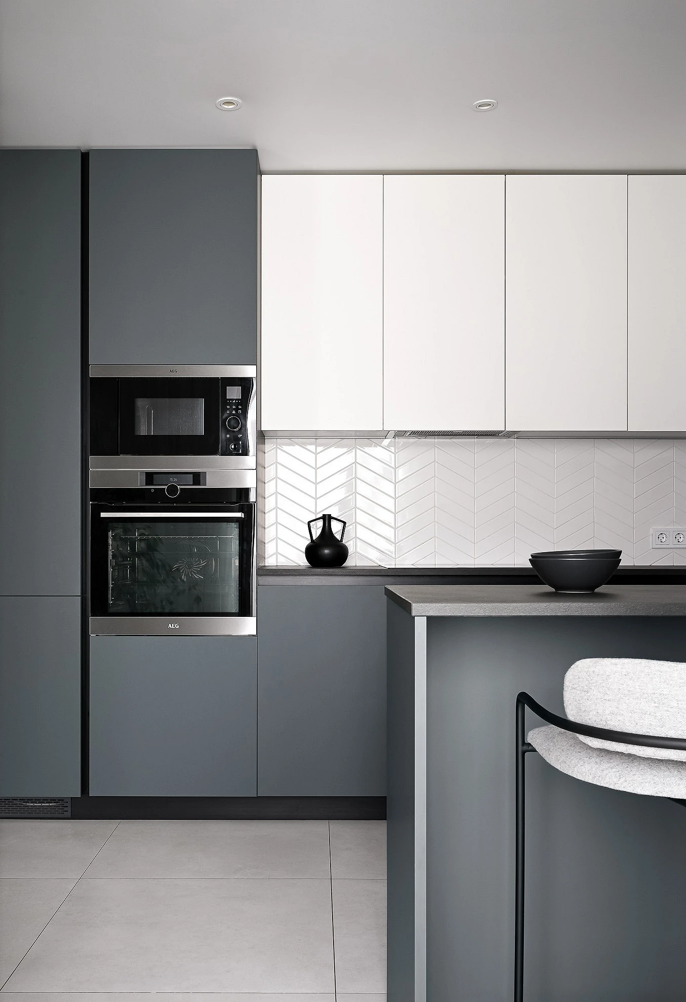 Также можно сделать серым верхний ряд шкафов. Обычно так поступают, когда внизу установлена яркая мебель. Чтобы она не раздражала и не перетягивала все внимание на себя, ее уравновешивают нейтральными и строгими оттенками.