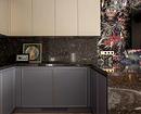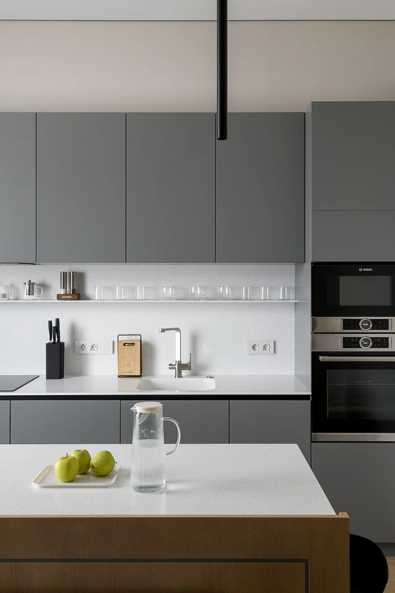 Можно пойти другим путем и сделать в сером кухонный гарнитур или его часть: столешницу, фартук либо фасады. Кухня с темно-серой столешницей не только элегантна, но и практична: на ней мало заметны загрязнения (в том числе, от высохших капель воды) и не видны отпечатки пальцев. Фартук аналогичной расцветки может как дополнять ее, так и выступать сольно, ведь благодаря своим размерам он легко станет доминантой в интерьере.
