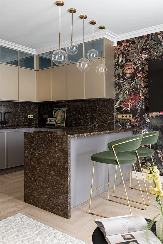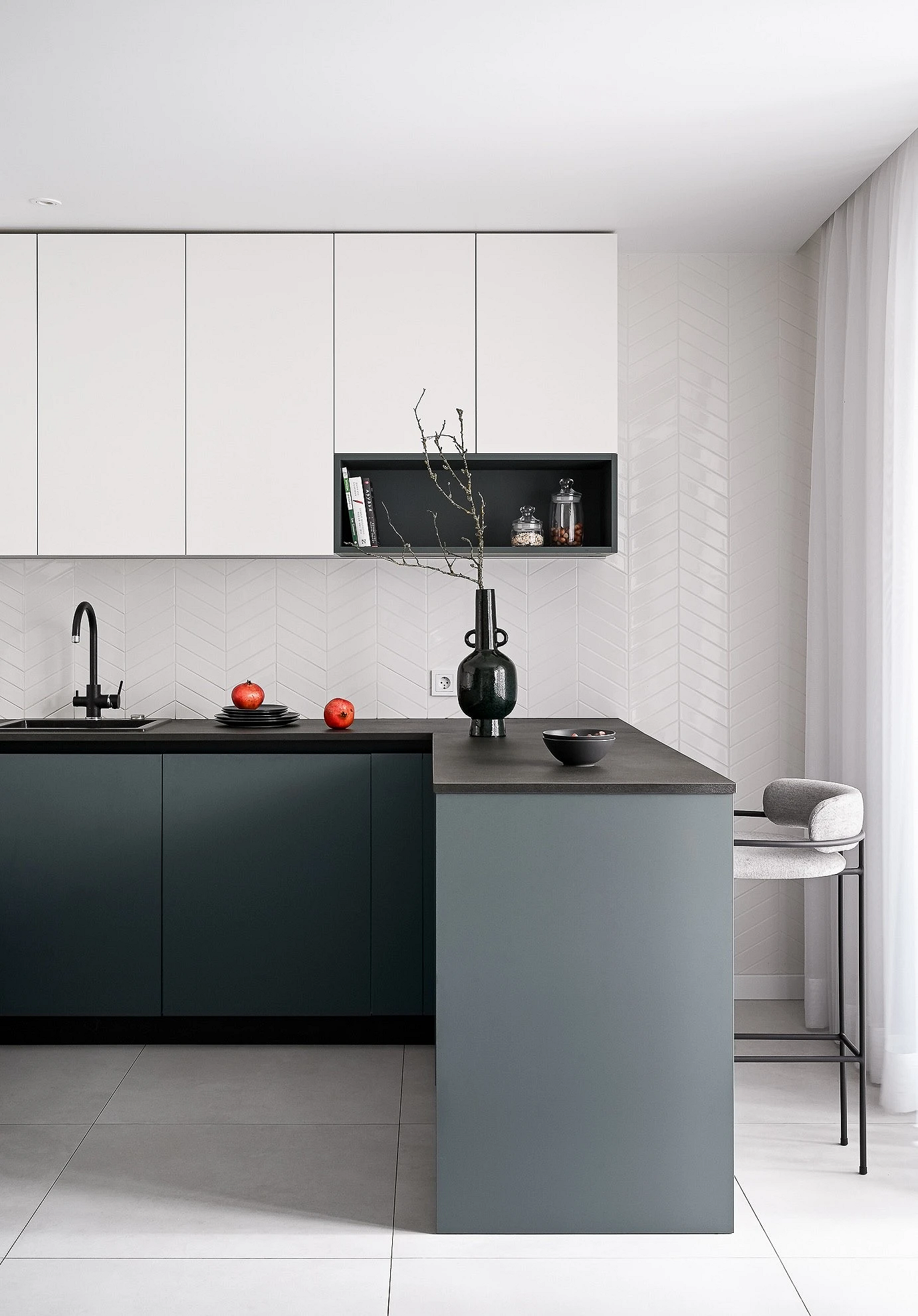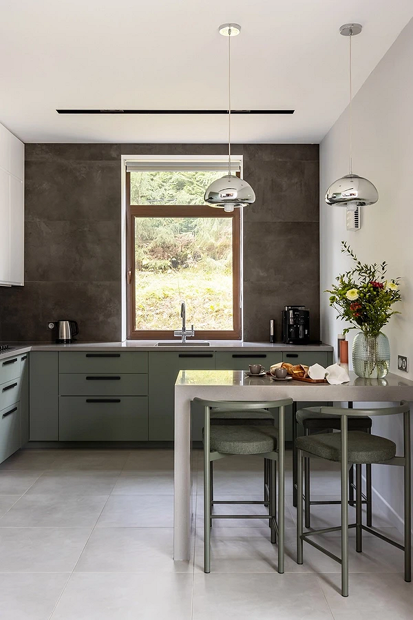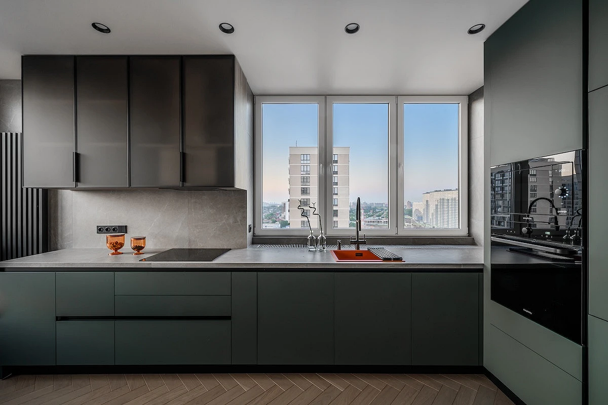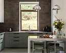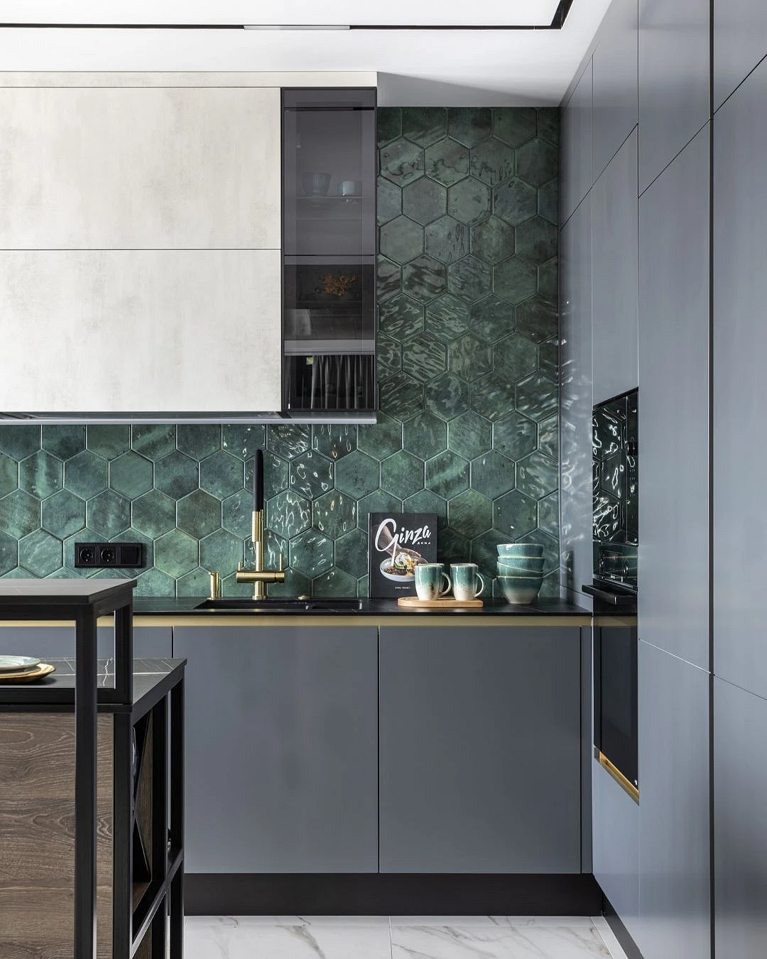 Оттенки зелени оживят нейтральный интерьер, сделав его более интересным. Серо-зеленая кухня одинаково хорошо смотрится как в более темных вариациях, так и в максимально светлых. При этом легкие перламутрово-серебристые расцветки с салатовыми штрихами поднимают настроение и дарят заряд бодрости. Насыщенные базальтовые и изумрудные тона, напротив, придают обстановке солидность и обстоятельность.