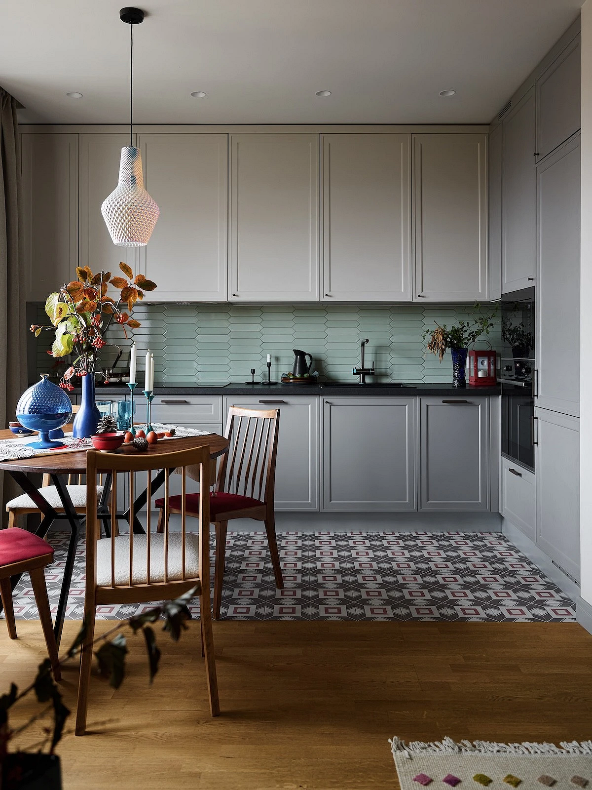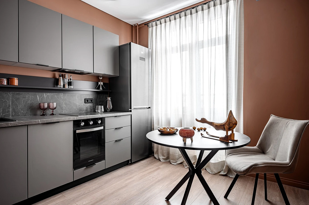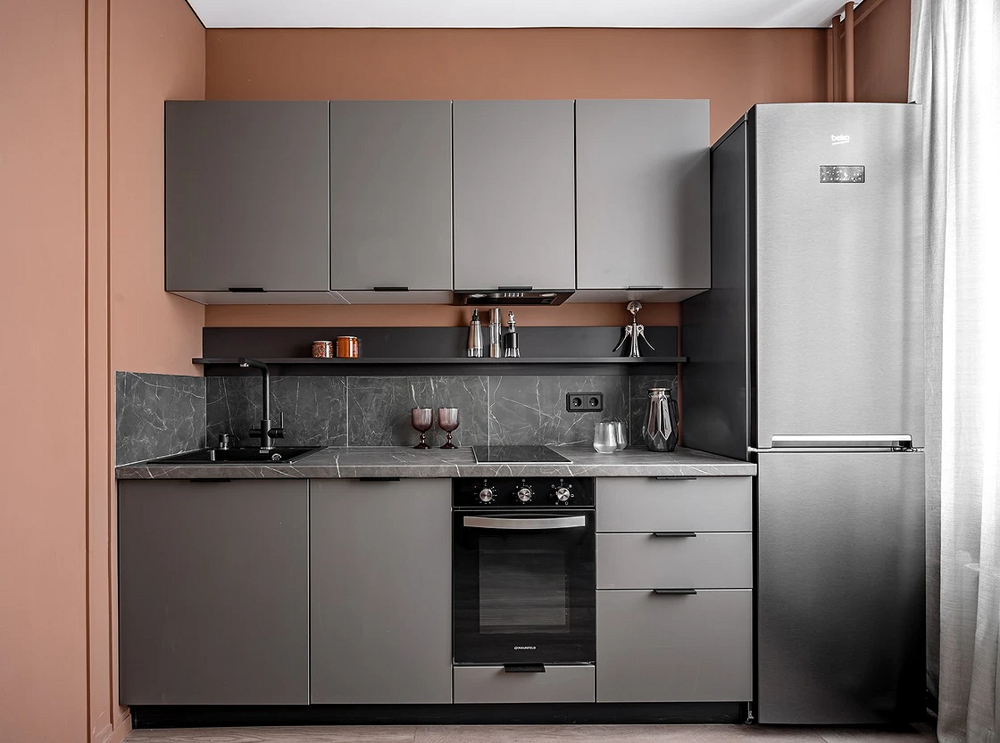 Один из самых распространенных вариантов — серые стены на кухне. Они выступают в качестве базы, на фоне которой выстраивается остальная цветовая композиция. Такой подход позволяет объединить практически любые хроматические тона, и они не будут противоречить друг другу.