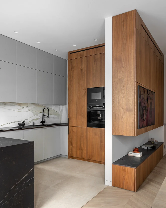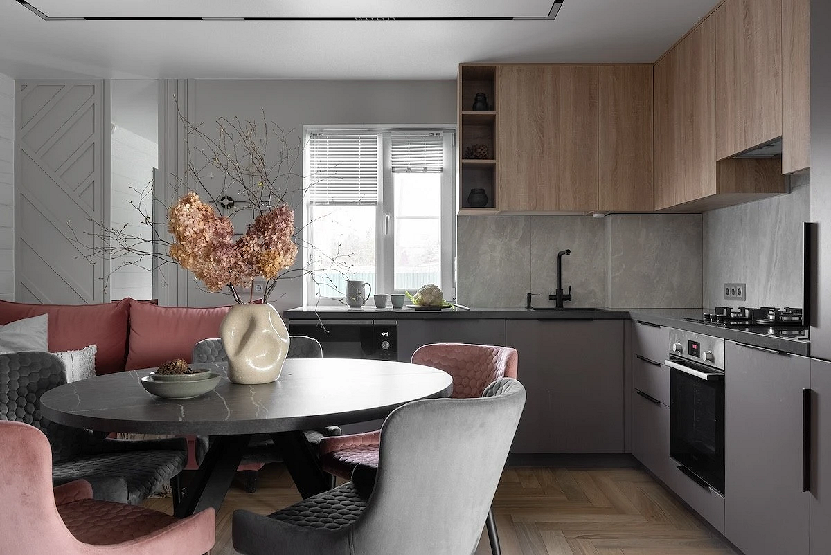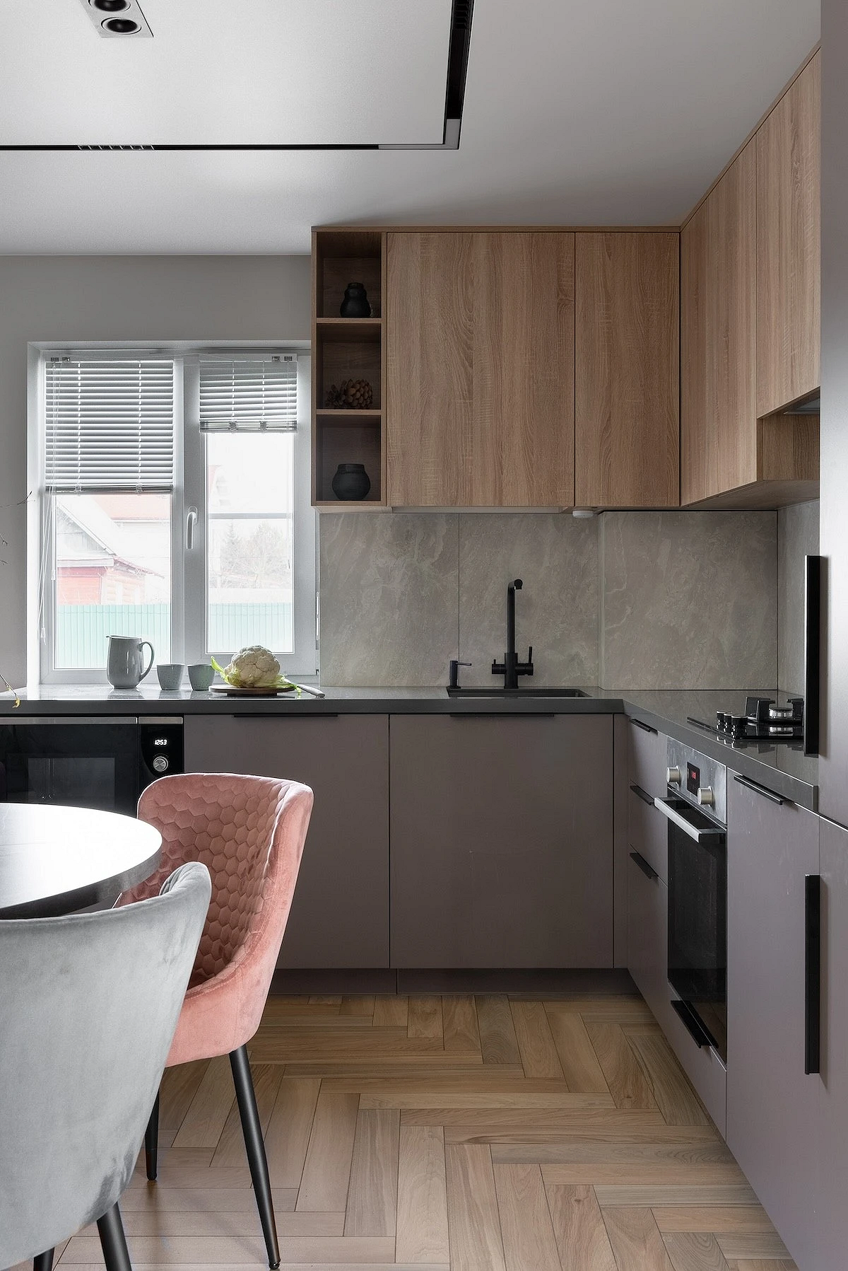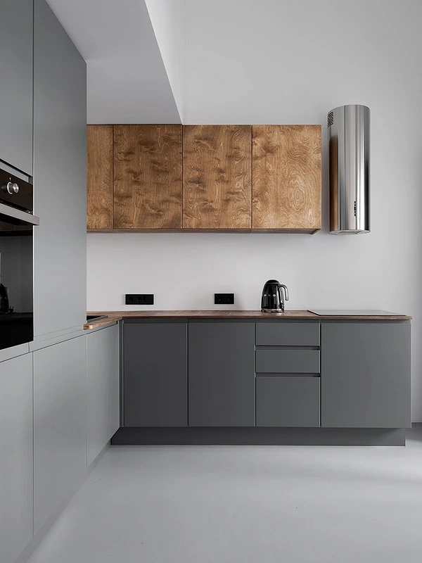 Интерьеру кухни сочетание серого с деревом дарит уют за счет теплых древесных тонов и утонченное благородство: нейтральные пепельные краски сводят к минимуму ассоциации с кантри и рустиком.