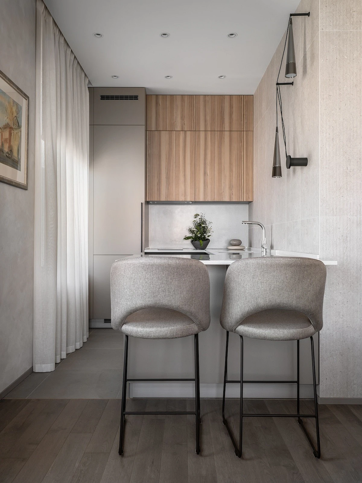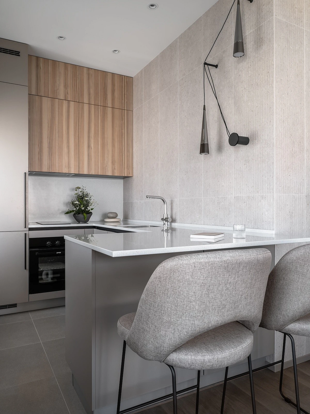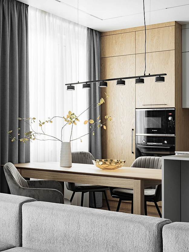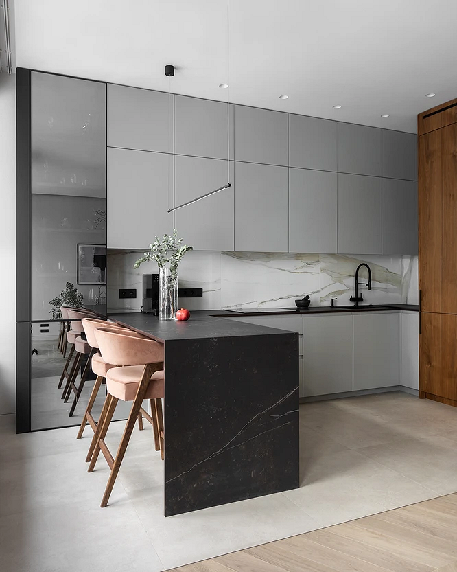 Интерьеру кухни сочетание серого с деревом дарит уют за счет теплых древесных тонов и утонченное благородство: нейтральные пепельные краски сводят к минимуму ассоциации с кантри и рустиком.
