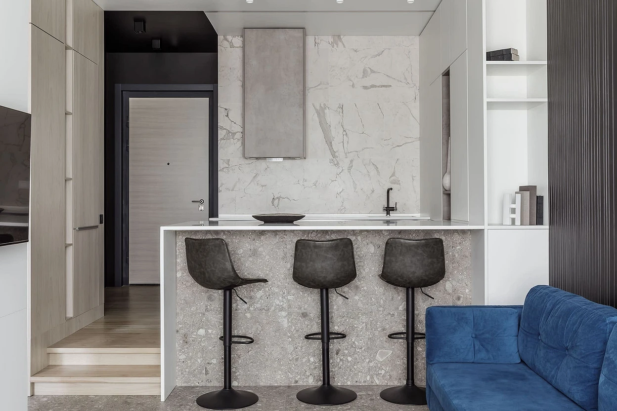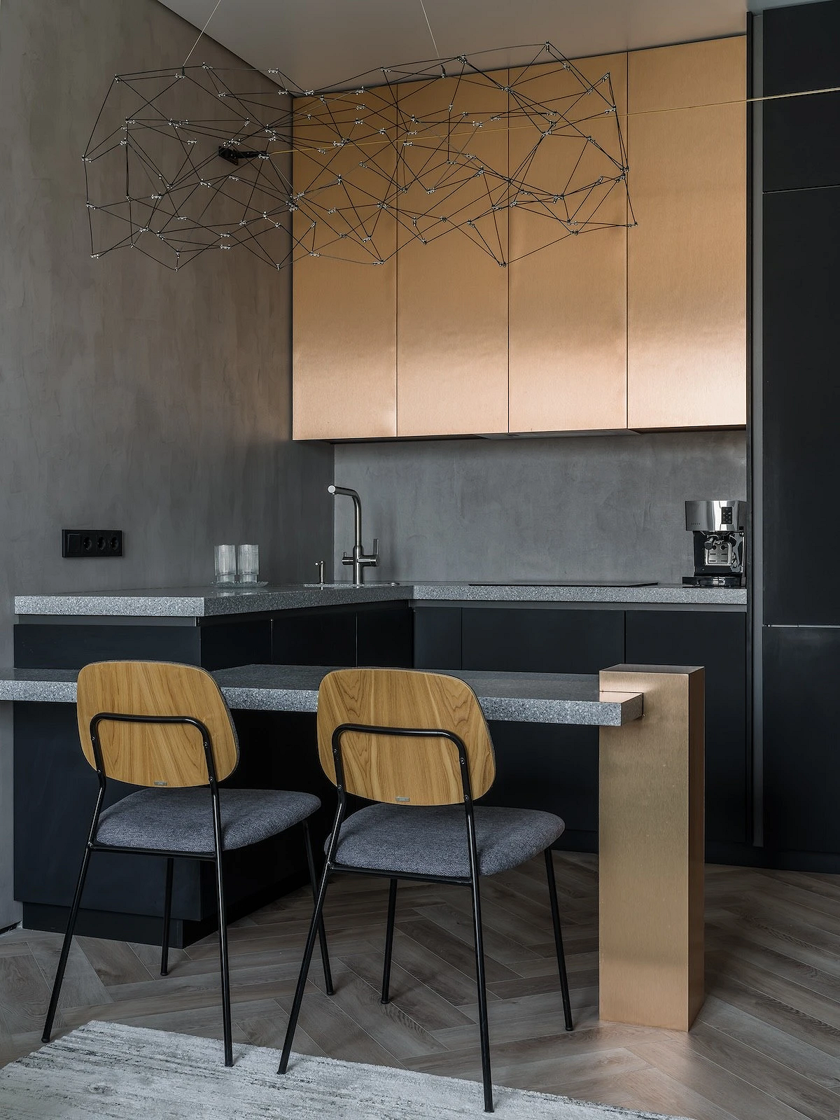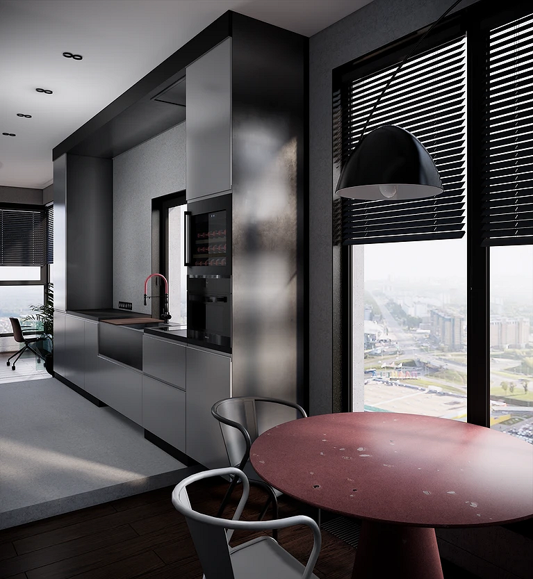 Обычные серые обои на кухне могут выглядеть слишком банально, поэтому их часто заменяют на декоративную штукатурку или краску, а в помещении в стиле лофт вполне уместно оставить голые бетонные поверхности. Выбирая отделку отдавайте предпочтение материалам с красивой фактурой (рельефные, неоднородные), которые подчеркнут эстетику грифельных тонов. Дополнит картину пол в той же гамме.