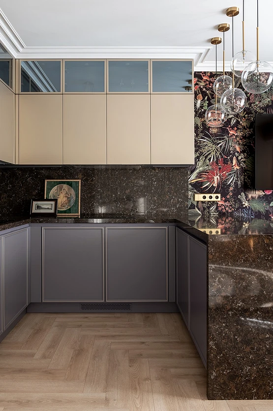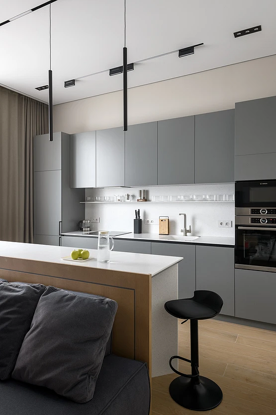 Если вам нравится сероватая палитра, но есть ощущение, что она будет давить и угнетать, сделайте на кухне серый низ и светлый верх. Тогда стальных тонов получается не слишком много, а за счет размещения у пола они не смотрятся громоздкими, даже если они совсем темные. Верхнюю часть оформляют либо в более светлых вариациях того же оттенка, либо в чисто белом цвете или пастельной гамме.