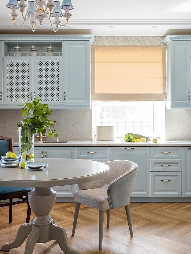 Серо-белая кухня смотрится легко, свежо и гармонично. Белый придает воздушность, а сизые расцветки добавляют основательности. На таком фоне легко расставлять яркие акценты, меняя их в зависимости от настроения: сегодня это дерзкая красная ваза, а завтра нежная лиловая дорожка на стол.