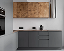 Серо-деревянная кухня уже стала классикой. Грифельные оттенки хорошо смотрятся с деревянными поверхностями. Заодно естественный рисунок на древесине разнообразит монотонный интерьер, расставляя ненавязчивые акценты.