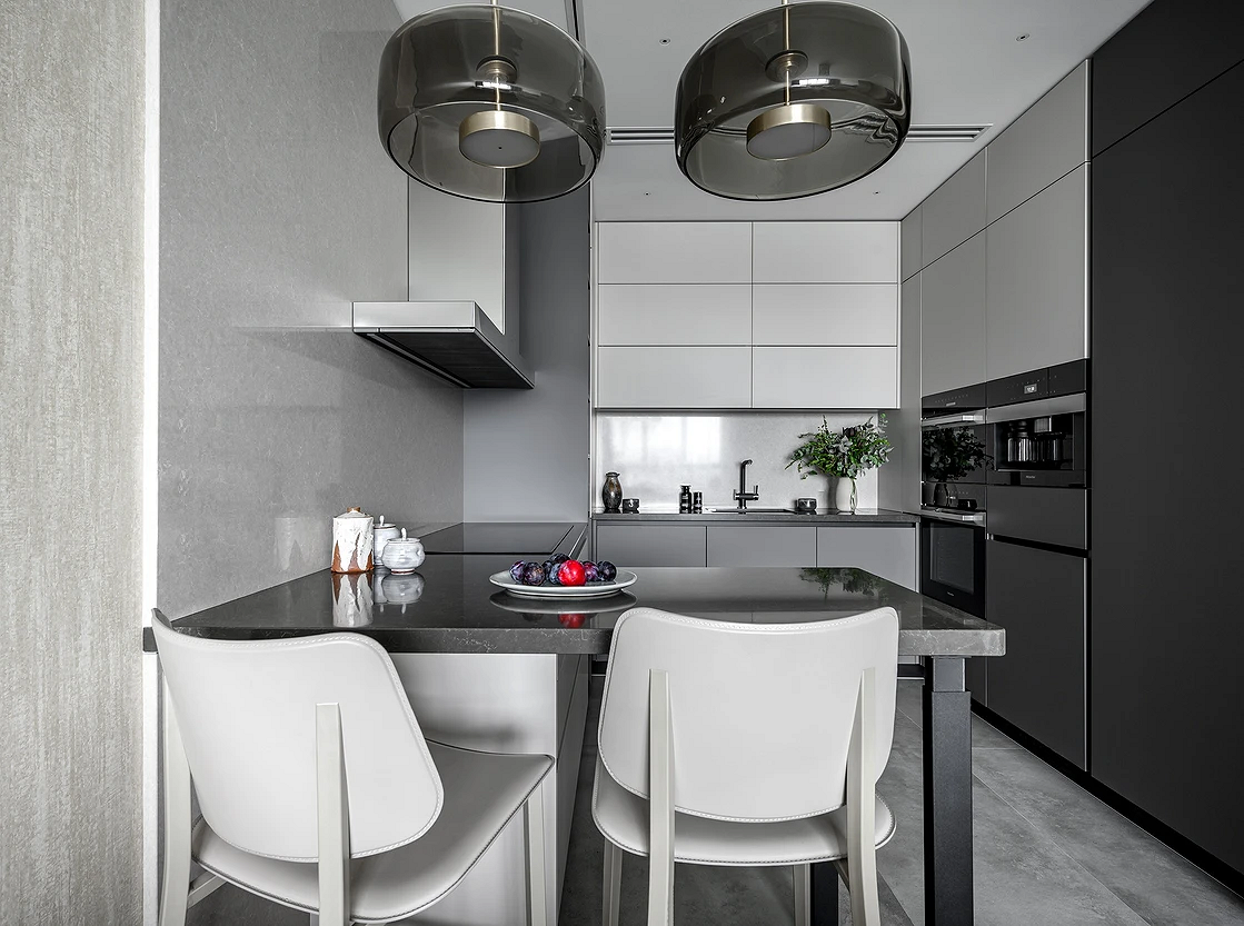Такой дуэт выглядит строго, дорого и утонченно. Это сочетание, которое выбирают успешные и уверенные в себе люди. Современная черно-серая кухня напоминает, скорее, помещение фешенебельного ресторана, чем тихий домашний уголок.