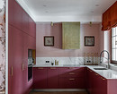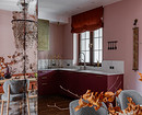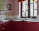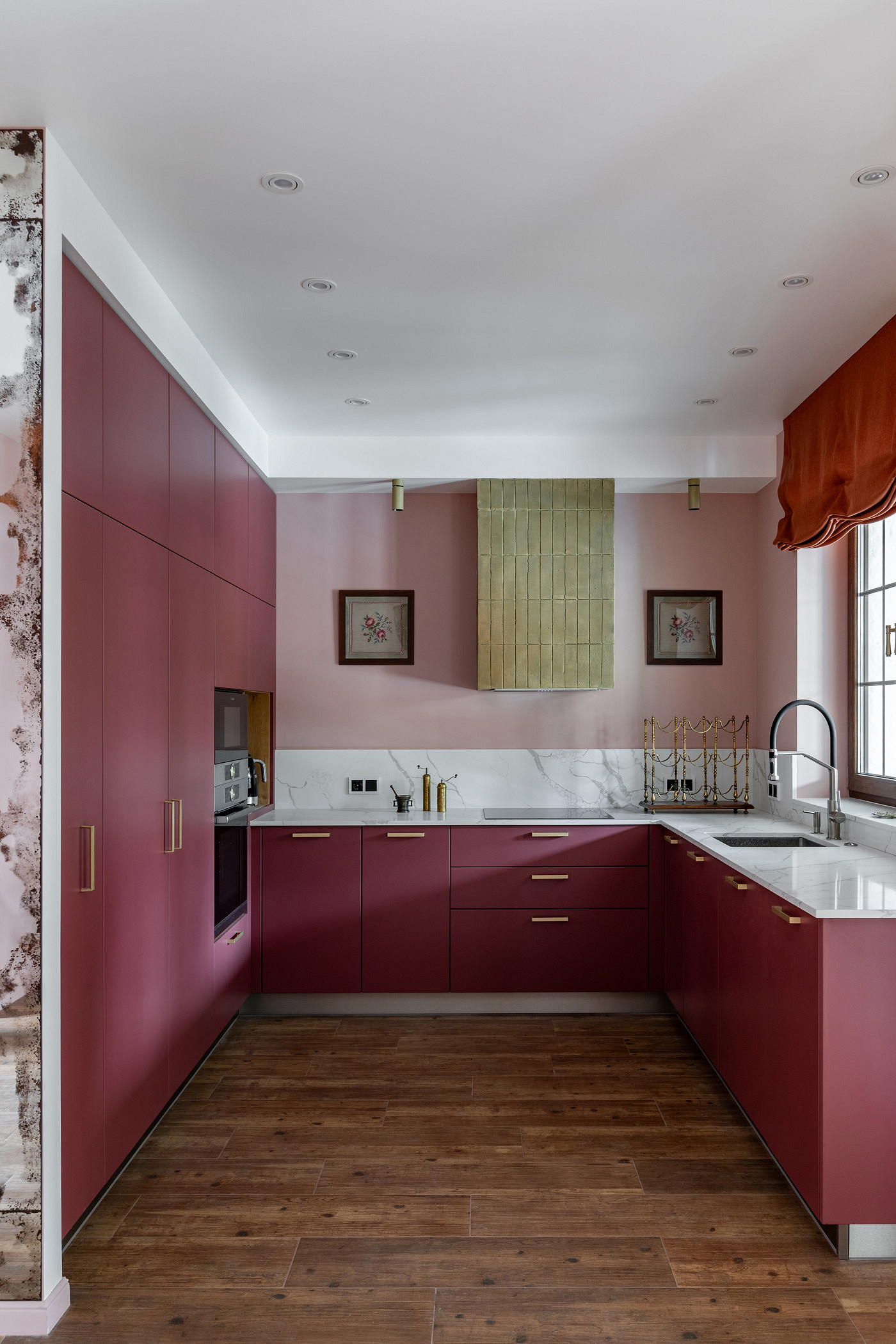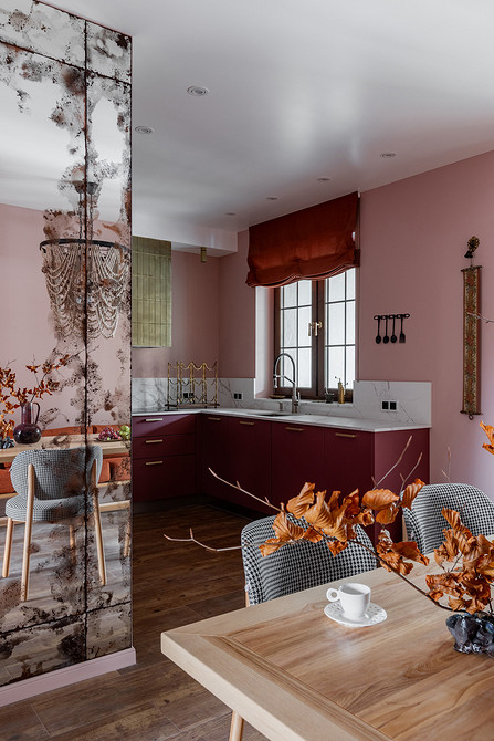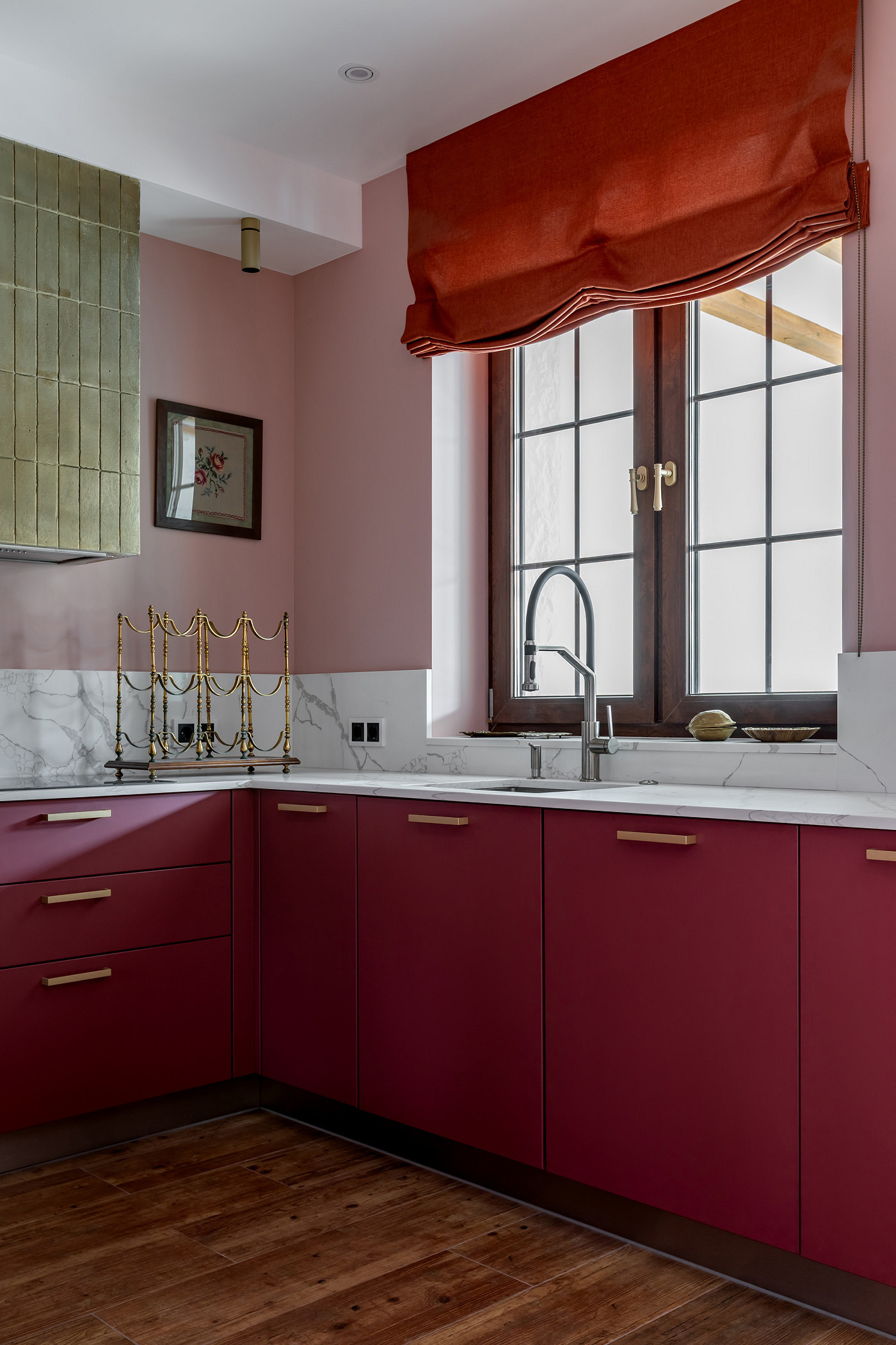 В проекте дизайнера Алины Рогут — таунхаусе в Калининграде — кухонный гарнитур выполнен в красивом, сложном цвете граната. Цвет стен (бледный персиково-розовый) сочетается с гарнитуром и переходит в соседние зоны — столовую и гостиную с прихожей. Римская штора на окне над мойкой подобрана максимально близко к оттенку фасадов. Это создает целостный «блок» в зоне приготовления пищи, не отвлекая внимание от других акцентов.