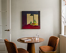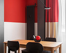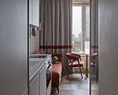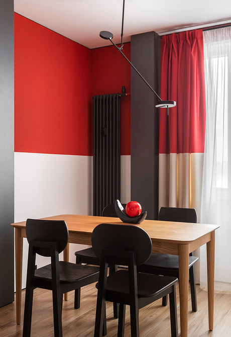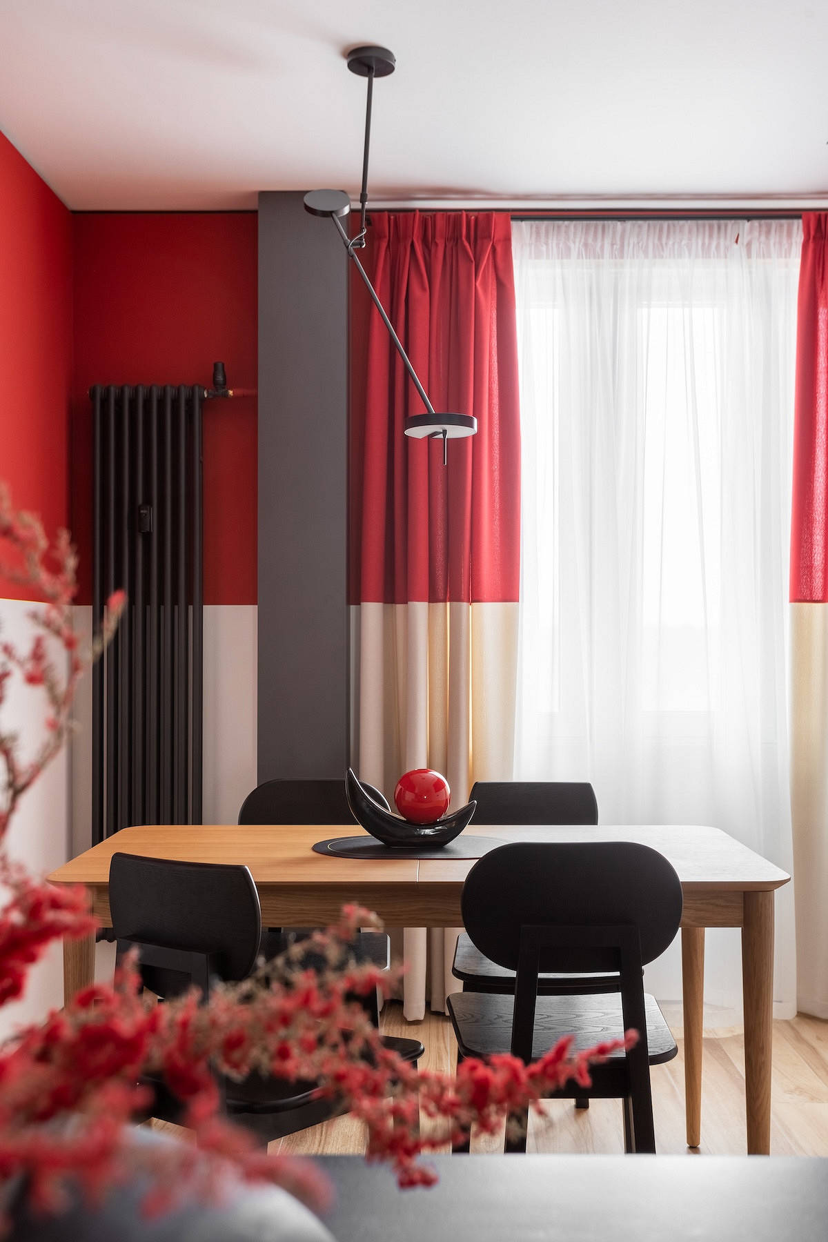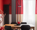 В квартире по дизайну Анны Людаевой на кухне использован контрастный прием окраски: верх стен — насыщенный красный, низ — нейтральный бежевый. Длинные шторы на окне не просто подобраны в тон, а повторяют этот же принцип цветовых блоков. Ткань визуально делится на две части, соответствующие уровням покраски. Это объединяет окно с плоскостью стены, делая его частью архитектурного решения.