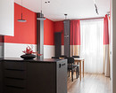 В проекте для молодой пары дизайнер Анна Пелипчук создала яркий контраст: красный кухонный гарнитур и желтая акцентная стена напротив. Под цвет желтой стены подобраны и диван, и штора на окне. В итоге сложилась гармоничная композиция: желтый блок (стена + диван + штора) противостоит красному блоку (гарнитур). Визуально это расширяет узкое пространство.