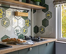 В этом проекте дизайнера Эльвиры Мисюро для девушки, увлекающейся ботаникой, фартук выложен шестиугольной плиткой с рисунками лимонов и веточек в комбинации с белым и зеленым фоном. Римская штора на окне выполнена не в тон плитке, а с цветочным рисунком. Этот прием работает на усиление: текстиль поддерживает «природное» настроение, заданное декором фартука, но не соперничает с ним за счет разного масштаба узора и разных материалов.