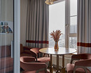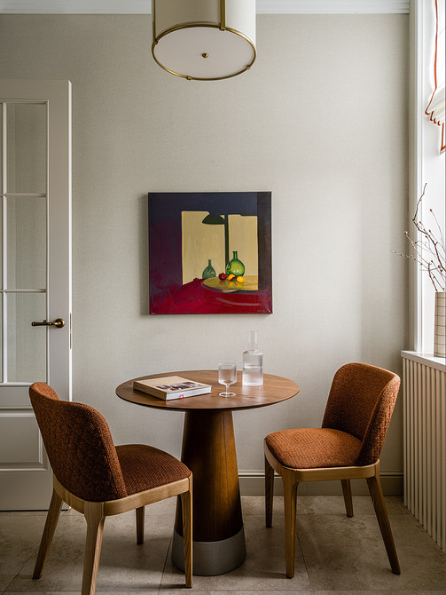 В сталинке для семьи с малышом архитектор Татьяна Казанцева создала интерьер в спокойных тонах. Так, на кухне бежевые стены, светлый гарнитур, керамогранит под камень на полу. На окне — римская штора из полупрозрачной ткани нейтрального цвета. Однако она не сливается с окружением благодаря терракотовому канту. Этот оттенок точно дублируется в обивке пары деревянных стульев в столовой зоне. Прием работает очень аккуратно: шторы и стулья «перекликаются», но без кричащих контрастов.