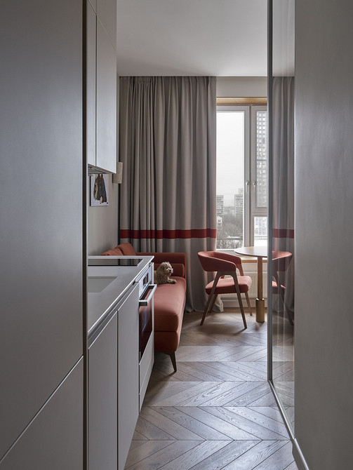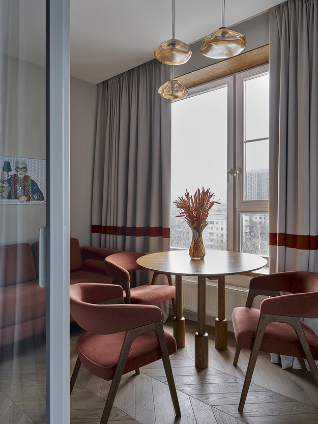 В однушке для мамы-дизайнера и двух сыновей авторы проекта использовали сложный прием. Длинные шторы на кухне выполнены в цвет стен (бежево-серый), что делает их мало заметными. Однако полоска на шторе сделана в цвете терракотового дивана в столовой зоне. Это создает ритм: цвет дивана «проходит» через штору.