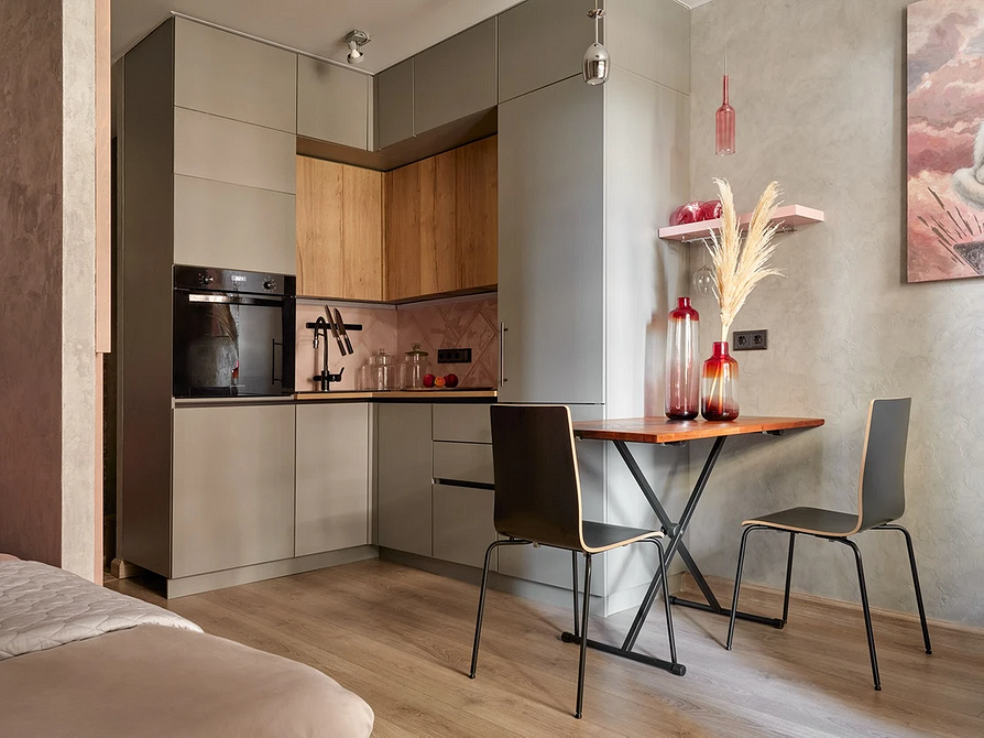 Избегайте массивных тяжелых моделей. Далеко не всегда, если столы для кухни маленькие (раскладные или откидные), это автоматически значит, что они смотрятся изящно. Иногда у них заметны детали механизмов, они могут оснащаться чересчур массивными ножками или непропорционально толстой столешницей. И если в большом помещении такие мелочи не бросаются в глаза, то в малометражке не замечать этого будет невозможно.