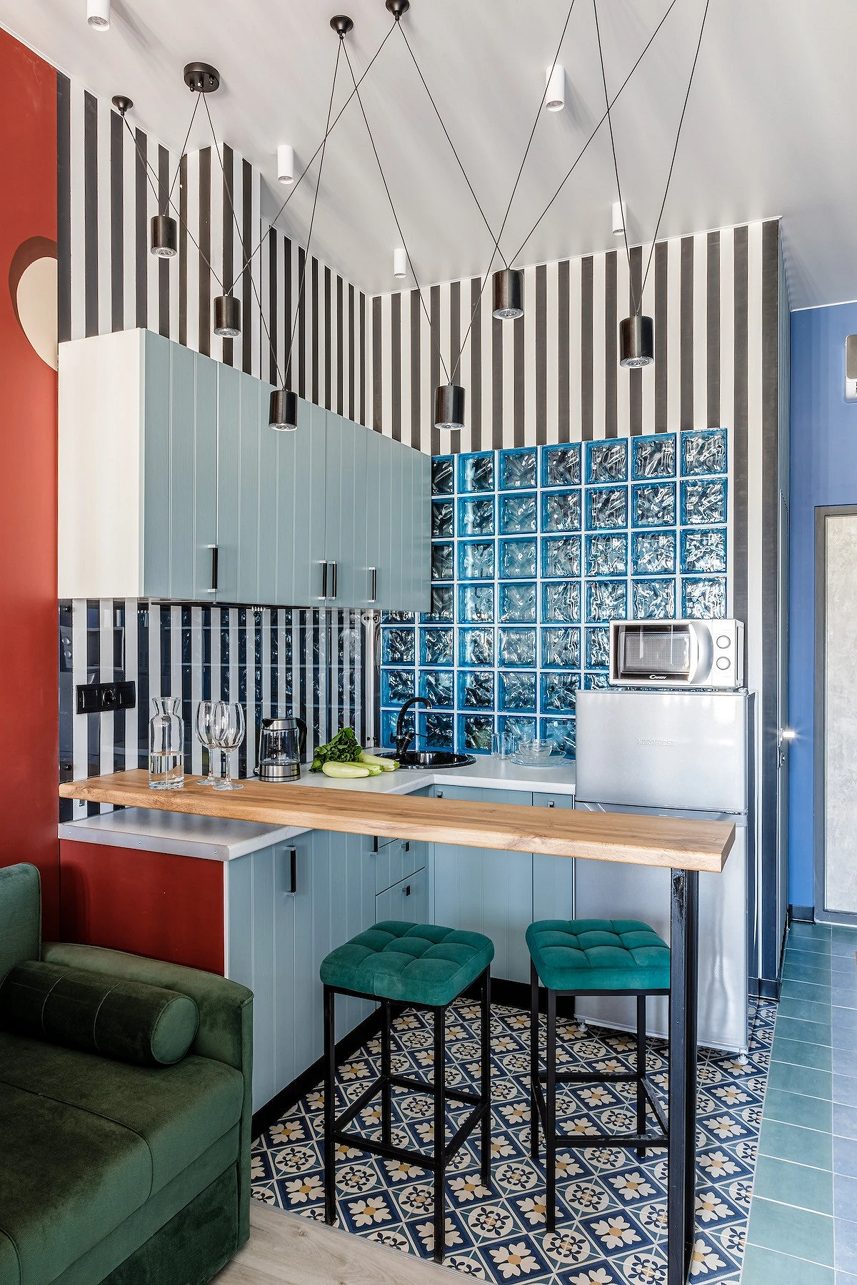 Белый, любые вариации бежевого, вся пастельная гамма будут зрительно расширять пространство. Яркие, броские и темные цвета лучше оставить для других комнат, где больше места. Хорошей идеей будет прозрачная стеклянная столешница: она смотрится легкой и невесомой.