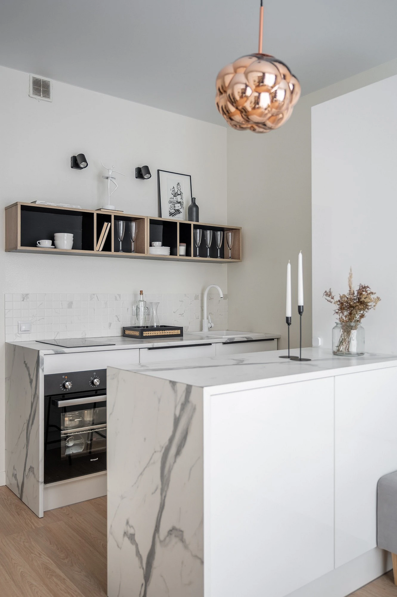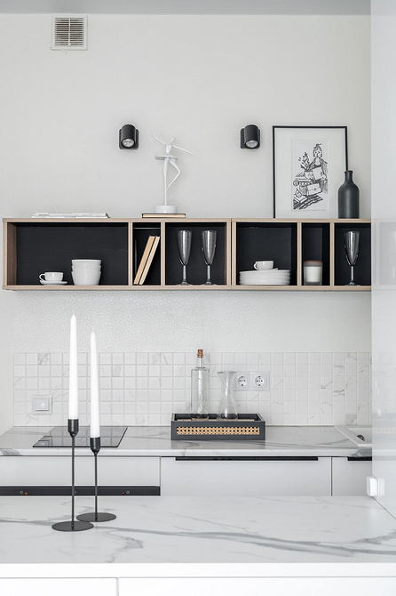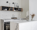 В этом проекте зона готовки тоже выполнена в белом цвете, но планировка отличается кардинально. Несмотря на маленькую площадь (всего 19 кв. м), на кухне установили остров. Он берет на себя часть хранения, также играет роль обеденной и рабочей зоны. Благодаря этому появилась возможность отказаться от верхних шкафов — вместо них сделали конструкцию с открытыми полками, где удобно хранить посуду. Получается красиво, не перегруженно и в то же время функционально.