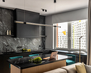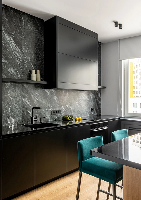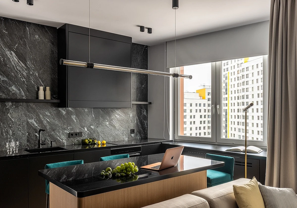 Эту однокомнатную квартиру дизайнеры спроектировали для будущего студента. За основу взяли минимализм и оформляли интерьер так, чтобы в нем было комфортно и отдыхать, и учиться. Кухню объединили с гостиной, для зоны готовки выбрали линейный гарнитур, который дополняет остров. Он же служит заменой обеденному столу. Поскольку молодому человеку не нужно много и активно готовить, вместо верхних шкафов сделали черные полки в тон фартуку и массивной вытяжке. Она, несмотря на монохромность палитры, играет роль лаконичного акцента. Для всей нужной техники хватило места в нижнем ярусе гарнитура.