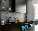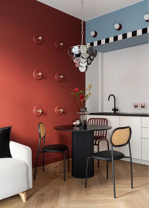 Эти апартаменты принадлежат женщине, которая постоянно живет с семьей за городом. Квартиру обустроили для временных остановок в городе, поэтому не было необходимости делать большую кухню с полноценным гарнитуром. Часть хранения организована в единой системе с прихожей: шкаф во входной зоне плавно перетекает в кухонный. Сама же зона готовки получилась облегченной: прямой гарнитур, контрастная вытяжка-цилиндр и ничего лишнего. Основной акцент — на ярких красках и смелом декоре.