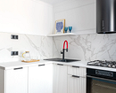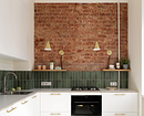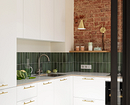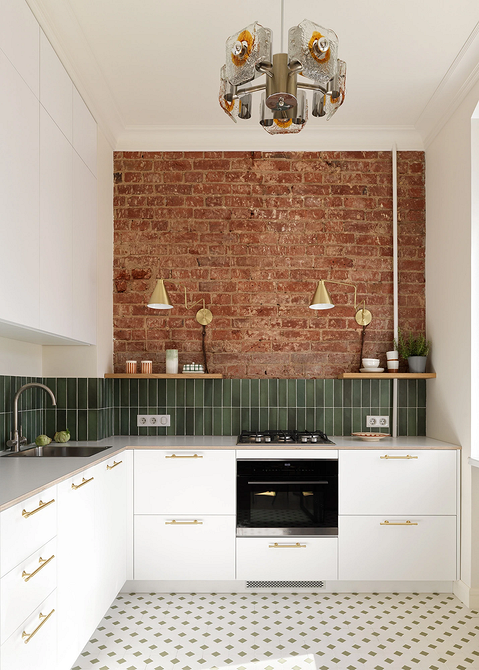 Не обязательно радикально отказываться от верхнего яруса гарнитура. Во многих проектах дизайнеры предлагают комбинированные решения: например, как здесь. Площадь кухни — меньше 7 квадратных метров, обеденную зону вынесли в гостиную. Небольшое пространство дизайнер оформила в том же эклектичном духе, что и остальную квартиру. Белый угловой гарнитур удачно контрастирует с кирпичной стеной и зеленой плиткой на фартуке. С одной стороны оставили только две симметричные полочки для посуды, с другой — светлые шкафы до потолка. В отличие от нижних они без ручек, поэтому почти полностью сливаются со стеной и за счет этого не перегружают зону готовки.