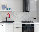 Эту квартиру на Садовом кольце дизайнер приобрела для последующей перепродажи и оформляла сама. Весь интерьер выполнен в светлых тонах, и кухня не стала исключением. Она получилась максимально воздушной и легкой: гарнитур подобран в тон белым стенам, благодаря чему практически растворен в пространстве. При этом пространство не кажется безликим за счет акцентов: черных ручек и вытяжки, яркого декора, цветного смесителя. Верхних шкафов нет вообще, только маленькая полочка. Но хранение и вся необходимая техника, включая посудомойку, поместились в нижний ряд.