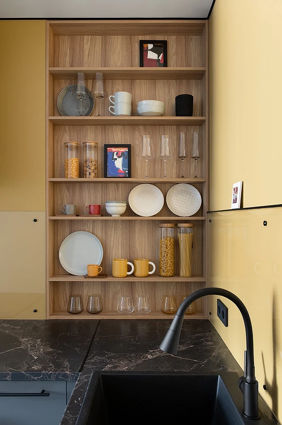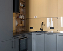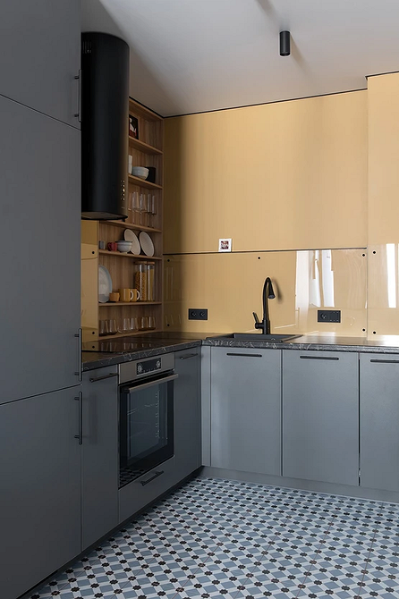 Эту небольшую однушку родители приобрели для дочери-студентки. Зону готовки обустроили в углу, установили Г-образный гарнитур, чтобы было достаточно места для хранения. От верхних шкафов было решено отказаться, поскольку девушка не планирует много готовить дома. Интересно обыграли нишу, которая уже была заложена застройщиком — установили стеллаж с открытыми полками для посуды. Получился практичный и декоративный элемент.