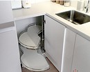 - Глубокий угловой ящик не всегда удобен. Достать что-то из дальней части напольного может быть проблематично, придется буквально забраться внутрь. А навесной может стать проблемой для людей невысокого роста. Поэтому такие секции мало подходят для хранения вещей, которые часто используются.