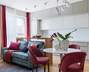 В этом проекте кухня объединена с гостиной, и на ней сделан минимальный акцент: бежево-белые фасады без ручек, белый фартук, который выполнен в единой концепции со столешницей и гарнитуром. Такое исполнение выглядит минималистично и гармонично — и светлые оттенки играют свою роль в создании такого образа.