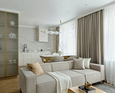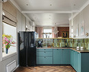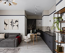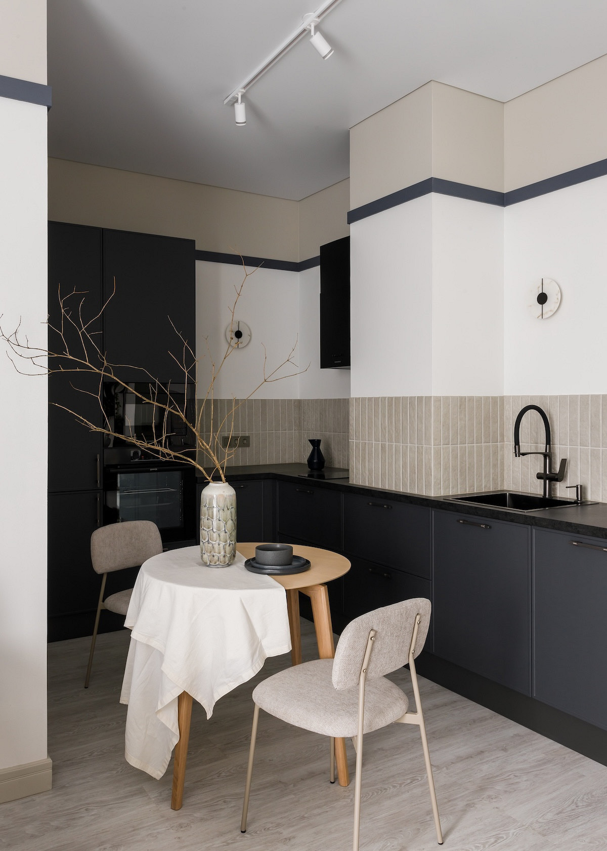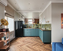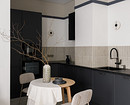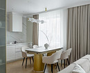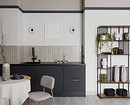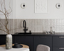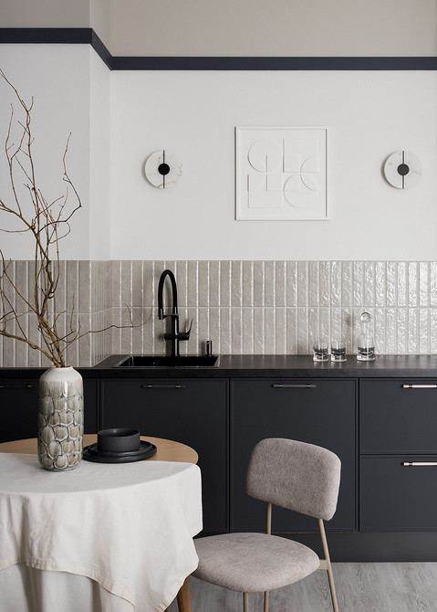 В этой квартире, которая принадлежит мужчине, решили не делать верхний ряд шкафов. Дизайнер Анна Сидорцова предложила вместительный нижний ряд и колонны со встроенными холодильником, духовым шкафом и СВЧ. В единственный верхний шкаф встроена вытяжка над плитой. А в основной части вместо шкафов на стене размещена картина в тонкой раме, по бокам от нее — изящные бра. Картина задает настроение, а бра решают сразу две задачи: вечером они освещают столешницу, облегчая готовку, а днем работают как самостоятельный декор, добавляя интерьеру завершенности и шарма.