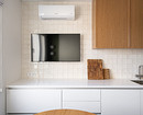Кухня всегда была центром семейной жизни, особенно в тех квартирах, где планировкой не предусмотрена гостиная, как в этом интерьере по дизайну Даниэлы Васюниной. Две комнаты были отданы под родительскую спальню и детскую, а кухня осталась единственной общей зоной, заменой гостиной, поэтому телевизор стал необходимым выбором. С точки зрения эстетики современные плоские модели отлично вписываются в любой стиль. Главное — предусмотреть розетку и надежное крепление на этапе планирования ремонта. Для комфорта в обеденной зоне поставили мини-диванчик. А ради практичности от верхних шкафов не отказывались полностью, повесили два шкафчика.