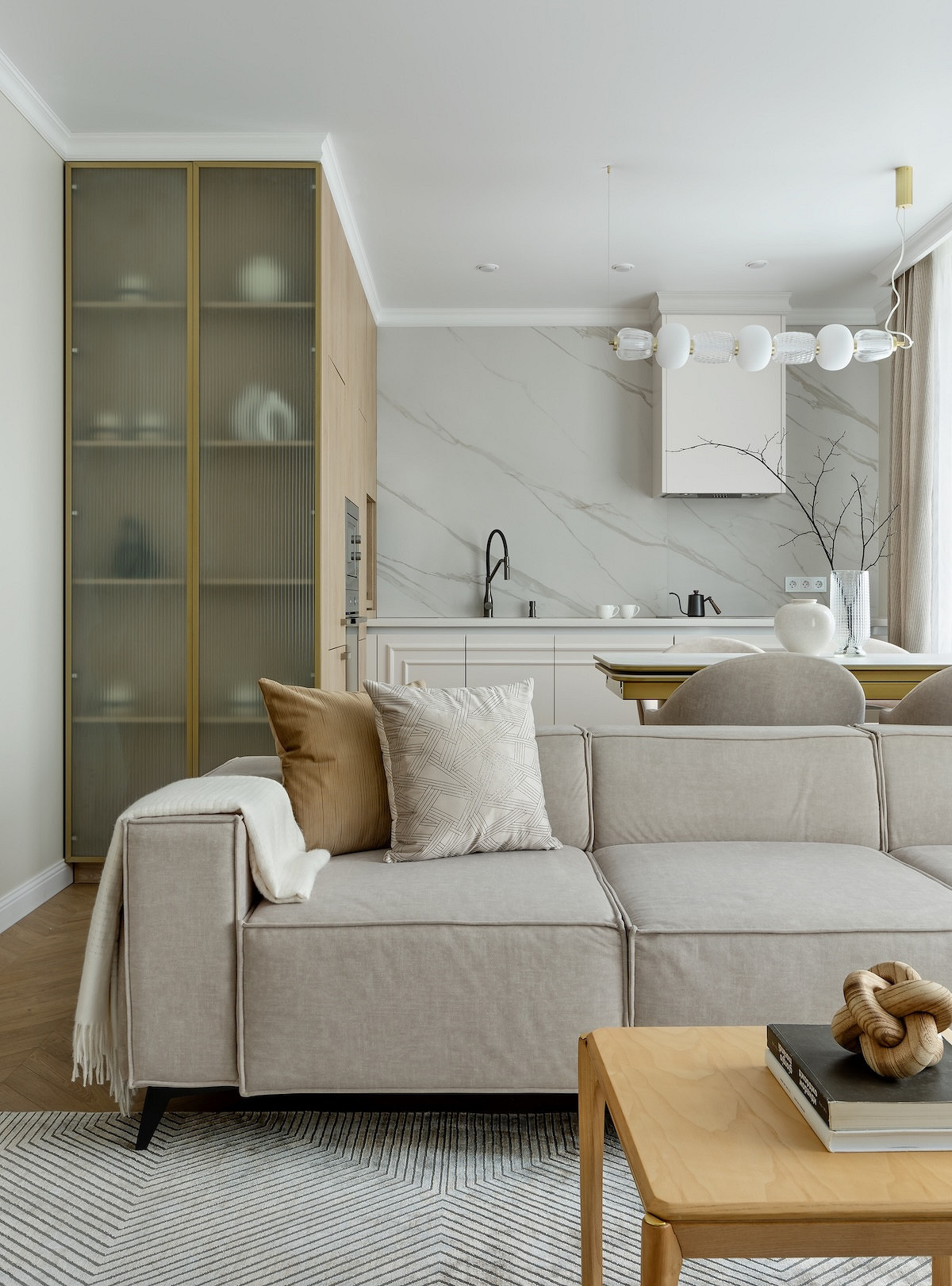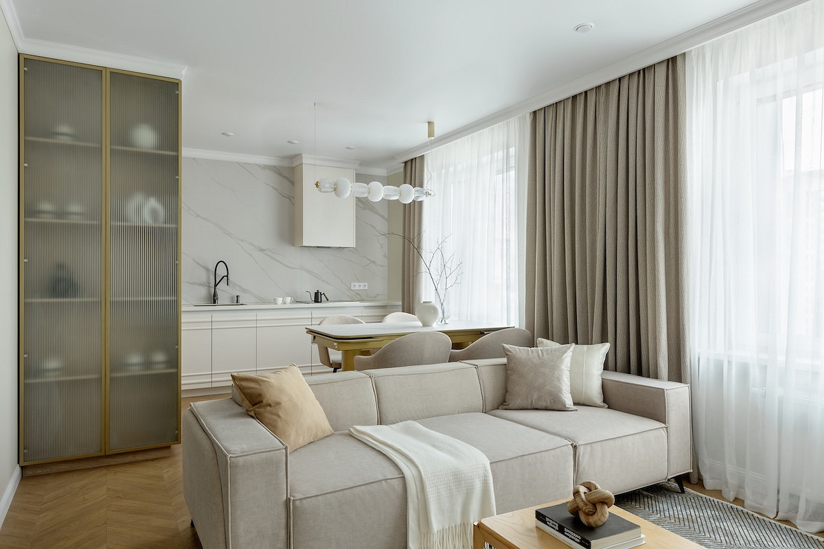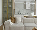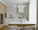 Дизайнер Кристина Назарова в этой квартире для многодетной семьи предложила отказаться от верхних шкафов, но их компенсировали рядом высоких шкафов-колонн, где не просто встроена техника, но и организовано вместительное хранение. Стена без шкафов, тем временем, оформлена крупноформатным керамогранитом под мрамор. Пространство выглядит цельным, монолитным и стильным. С практической точки зрения это еще и гигиенично: гладкую поверхность легко мыть, и ей не страшны брызги жира или воды.