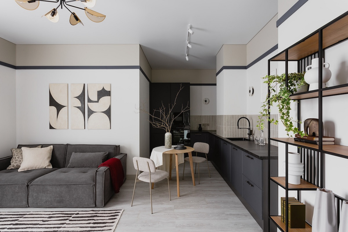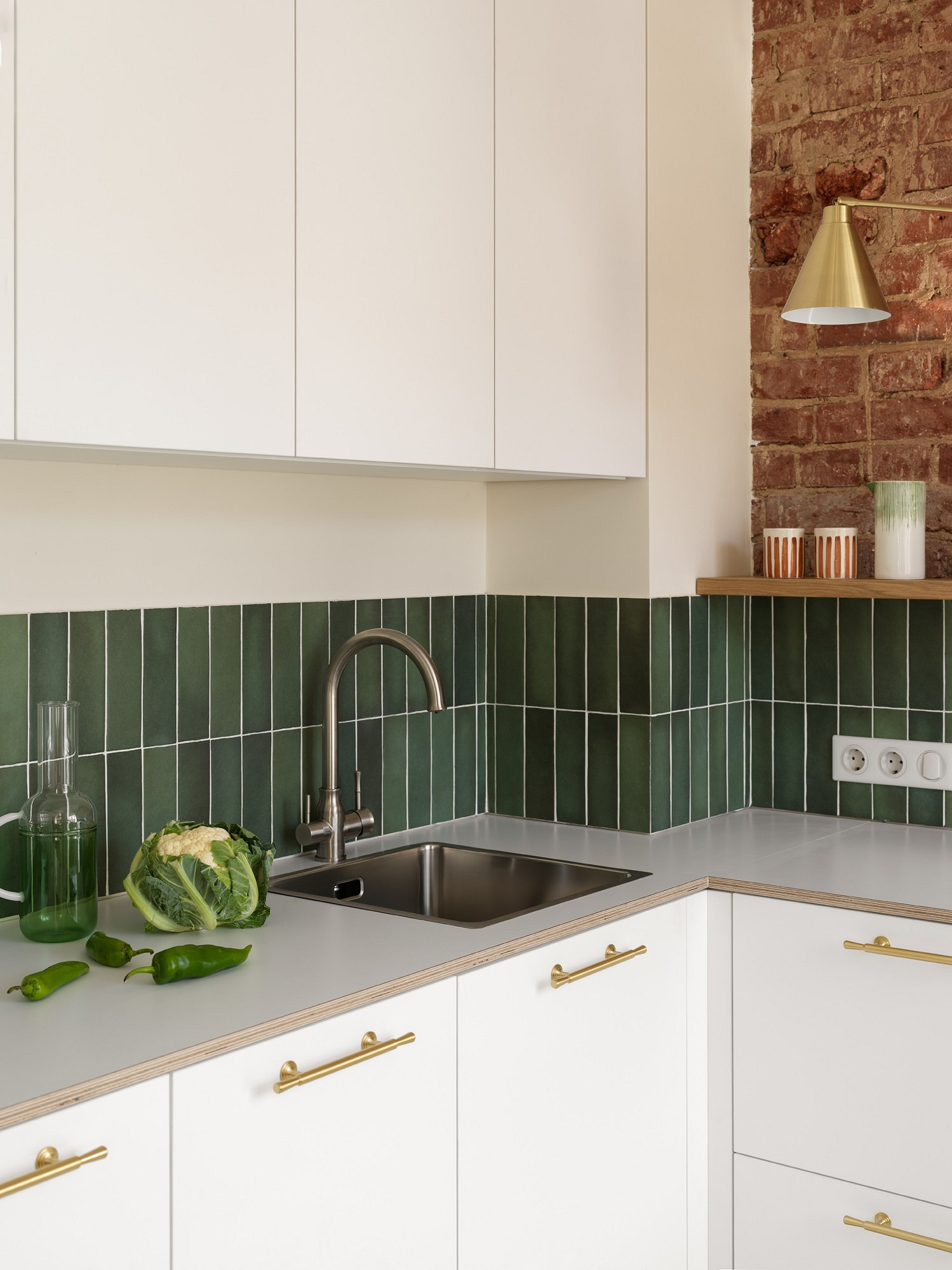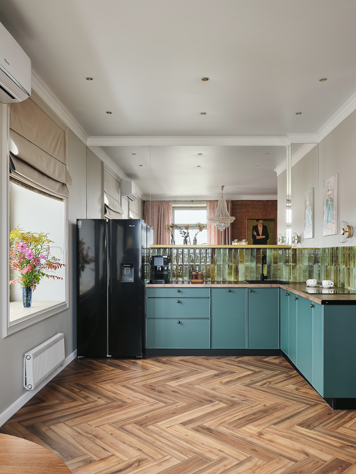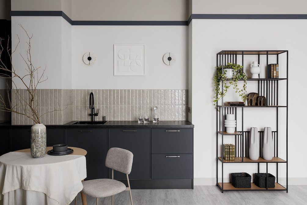 Этот пример — для обладателей квартир в кирпичных домах и для тех, кто ценит аутентичность. Дизайнер Анастасия Заркуа переделывала квартиру в доме 1914 года, и на одной из стен кухни вместо верхних шкафов оставили родную кирпичную кладку. Такой прием не требует дополнений: фактурный, неровный, со следами времени кирпич сам по себе является арт-объектом. Он привносит в интерьер тепло и глубину. Современная техника и мебель на таком фоне смотрятся особенно выразительно, создавая модный контраст эпох.