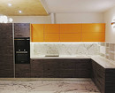 В гарнитуре, установленном вдоль двух стен, интересно смотрится повторение нижнего цвета в угловом шкафчике сверху. Тона можно чередовать: в шахматном порядке или один за другим.