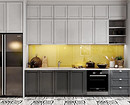 В идеале большая техника по цвету должна повторять мебель полностью или частично. Маленькие приборы могут быть яркими. Например, соковыжималка или чайник. Так в интерьере появится цветовой акцент без лишнего декорирования. Это неплохой прием для минималистичных кухонь. Яркую деталь комбинируют с расцветкой штор, обивкой дивана.