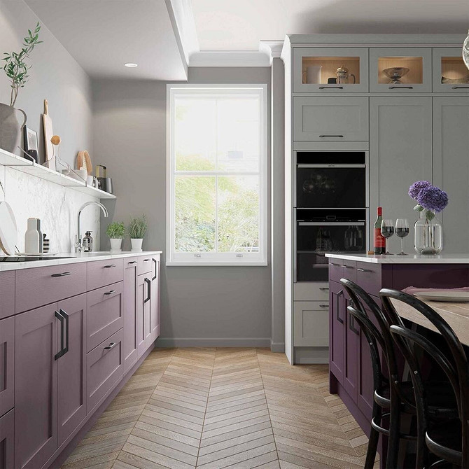 Хорошо смотрится такой гарнитур с глянцевой поверхностью. Цвета-компаньоны: светло-сиреневый, бежевый, бледно-желтый, сливочный.