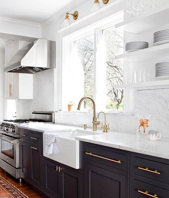 Кухня с темным низом и светлым верхом — оригинальный способ оформления. Конечно, черно-белая классика может показаться скучной, но речь не только о ней. Контрасты могут быть как резкими, так и мягкими. Какими бы они ни были, в результате интерьер выглядит более живым и необычным. Он становится динамичным, и даже линейный гарнитур в нем не выглядит скучно.